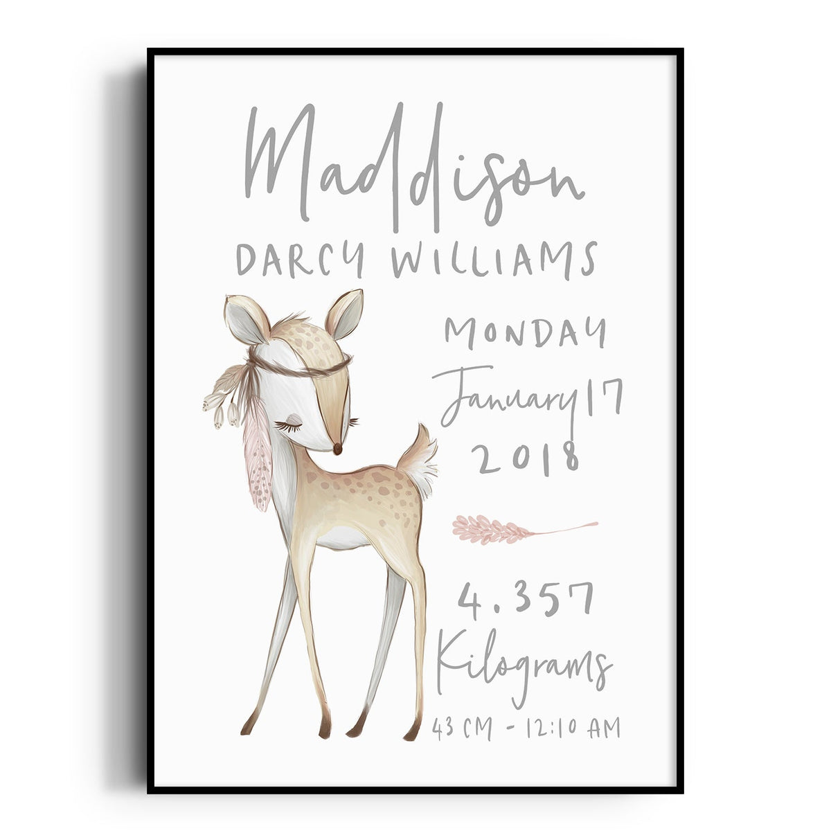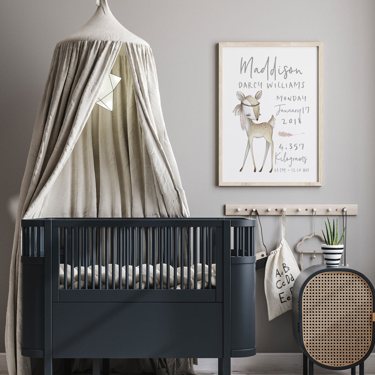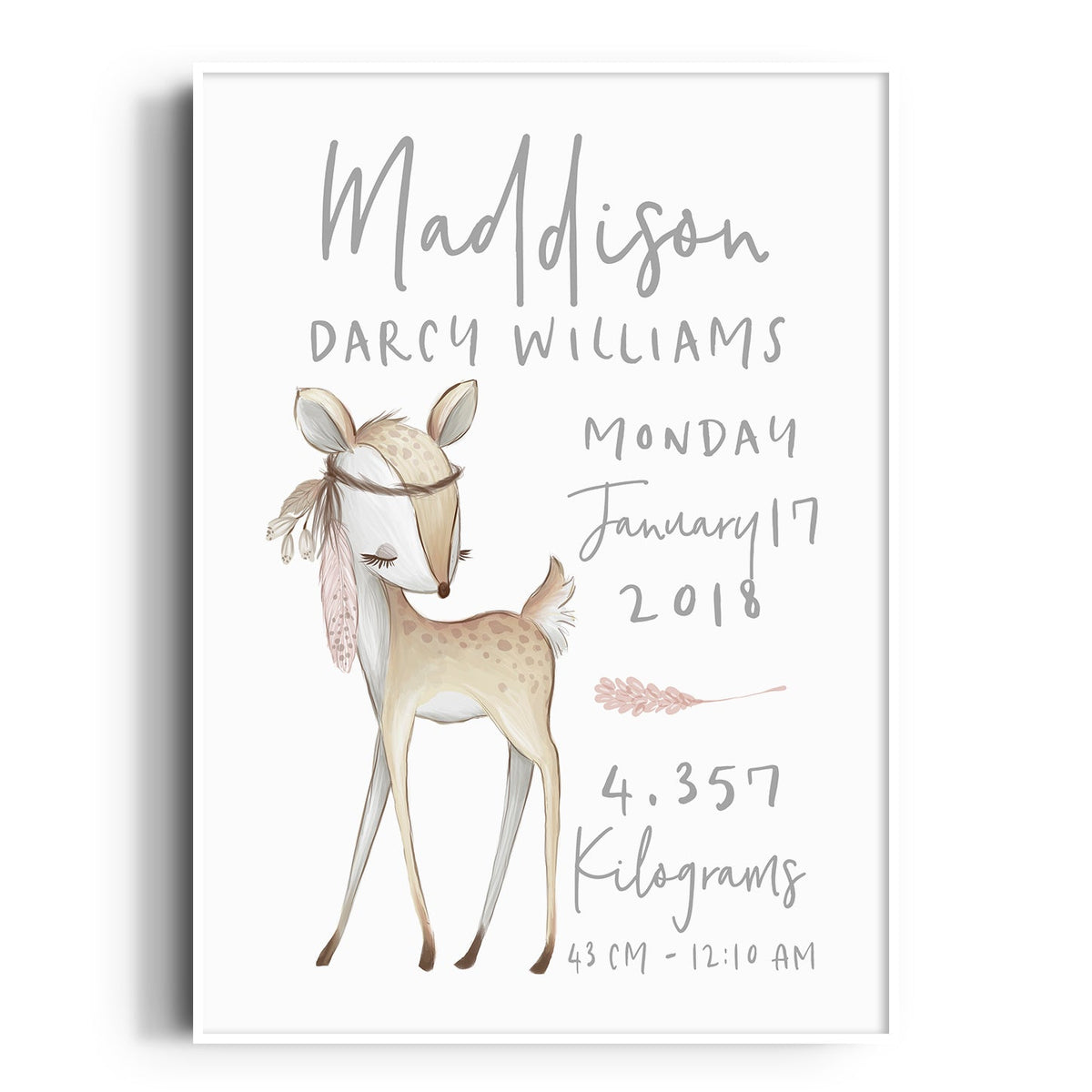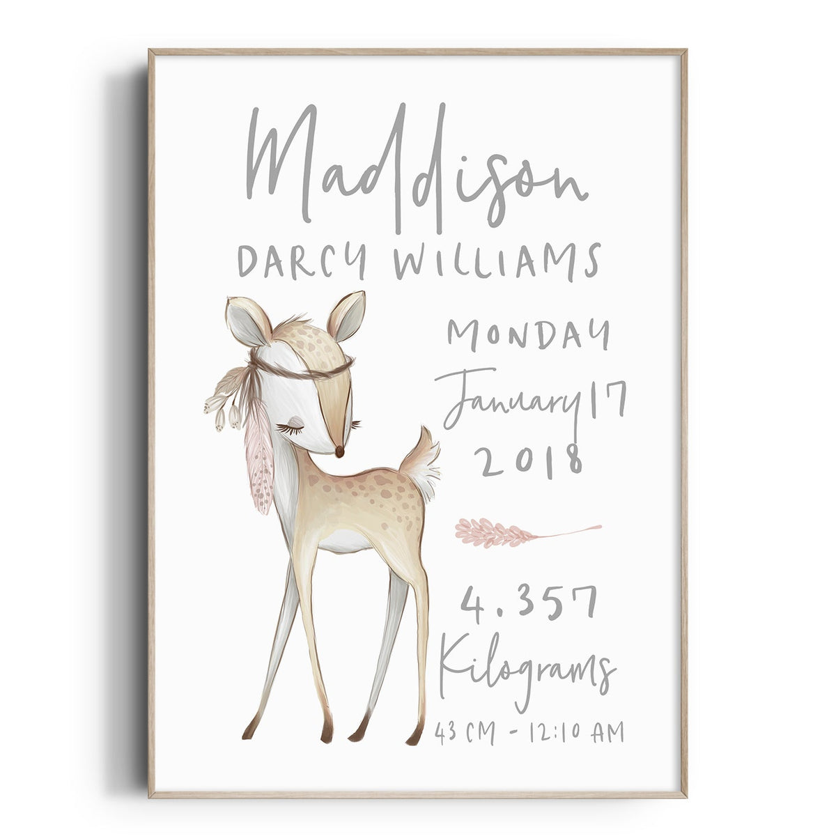 Unit price perThis beautiful Boho Woodland Deer Birth Print makes the perfect new baby gift. Personalized with the baby's birth details, this boho nursery wall art is an ideal way to decorate a nursery. Printed on high quality archival paper for long-lasting beauty.