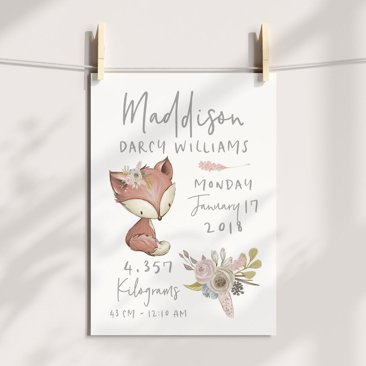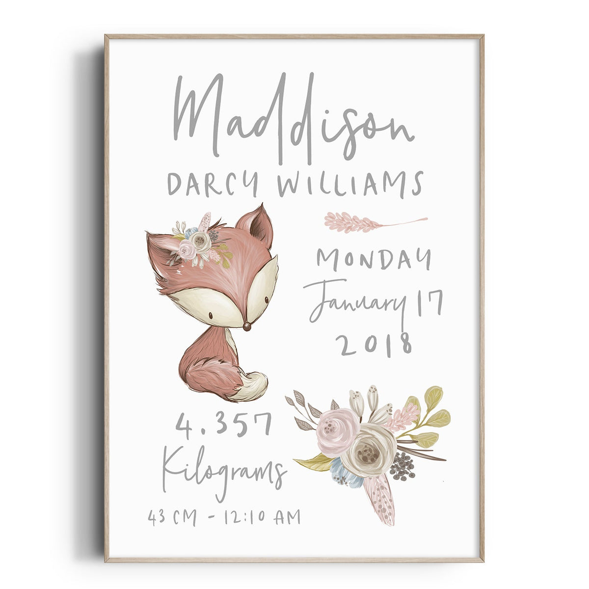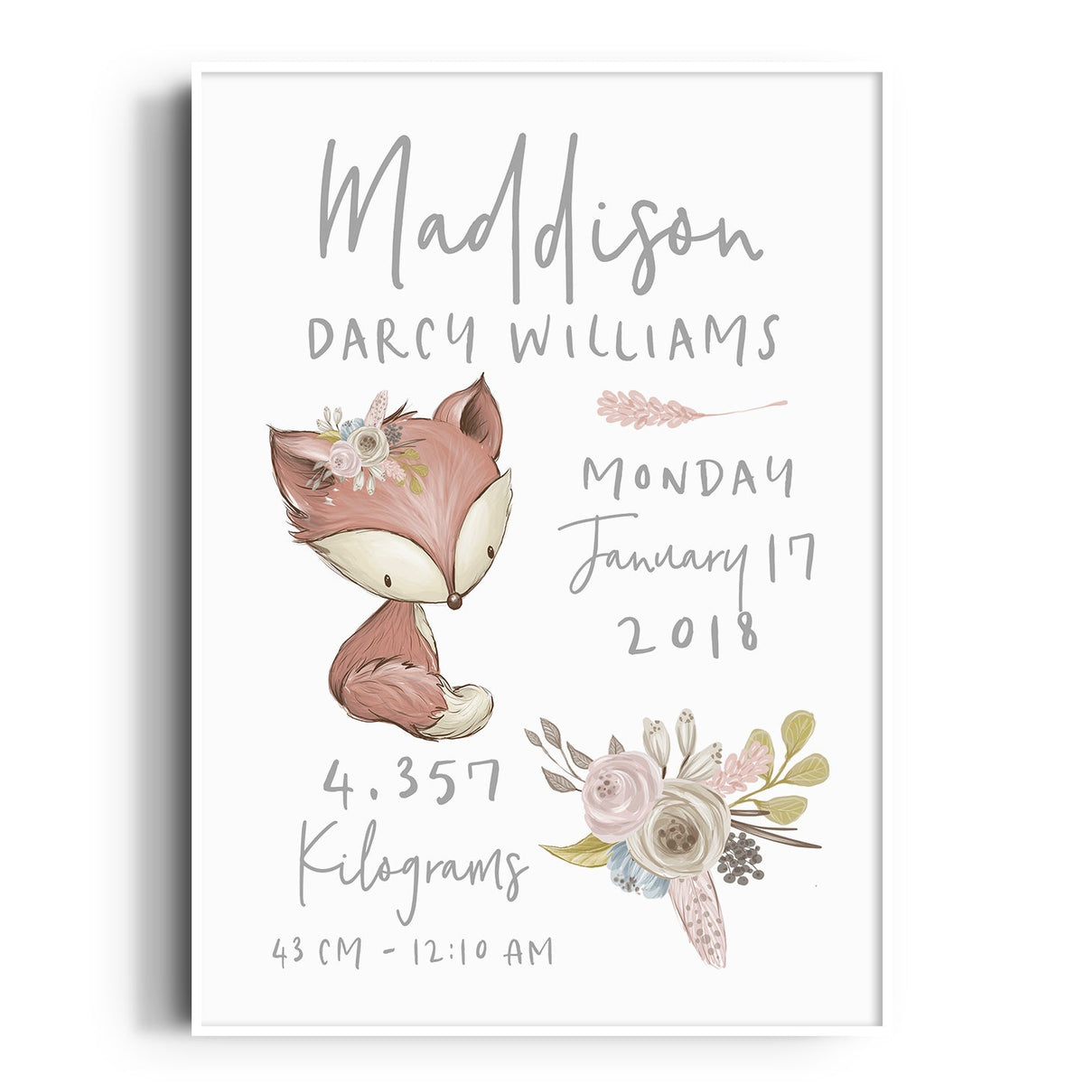 Unit price perWelcome your little one with this Floral Woodland Fox Birth Print. Customizable with your baby's name, date of birth, and weight, this beautiful piece of nursery art features a detail of an illustrated fox, perfect for your little one's woodland themed bedroom.