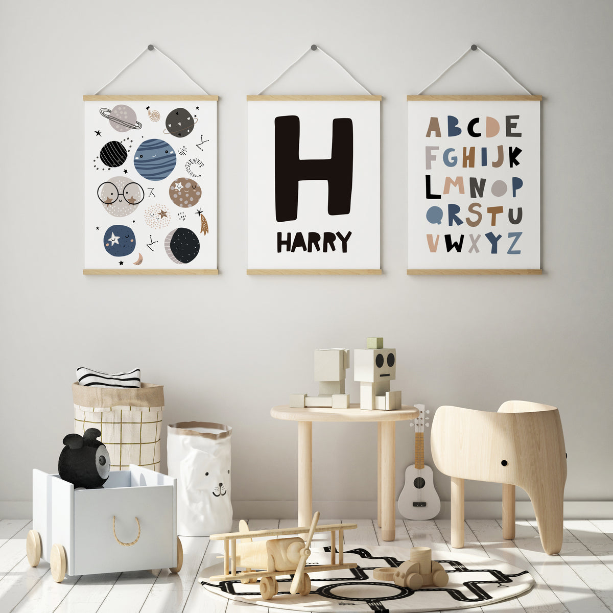A set of three prints, that includes an alphabet, solar system and personalised name print, the perfect addition to the space or planet themed nursery, bedroom or playroom decor.