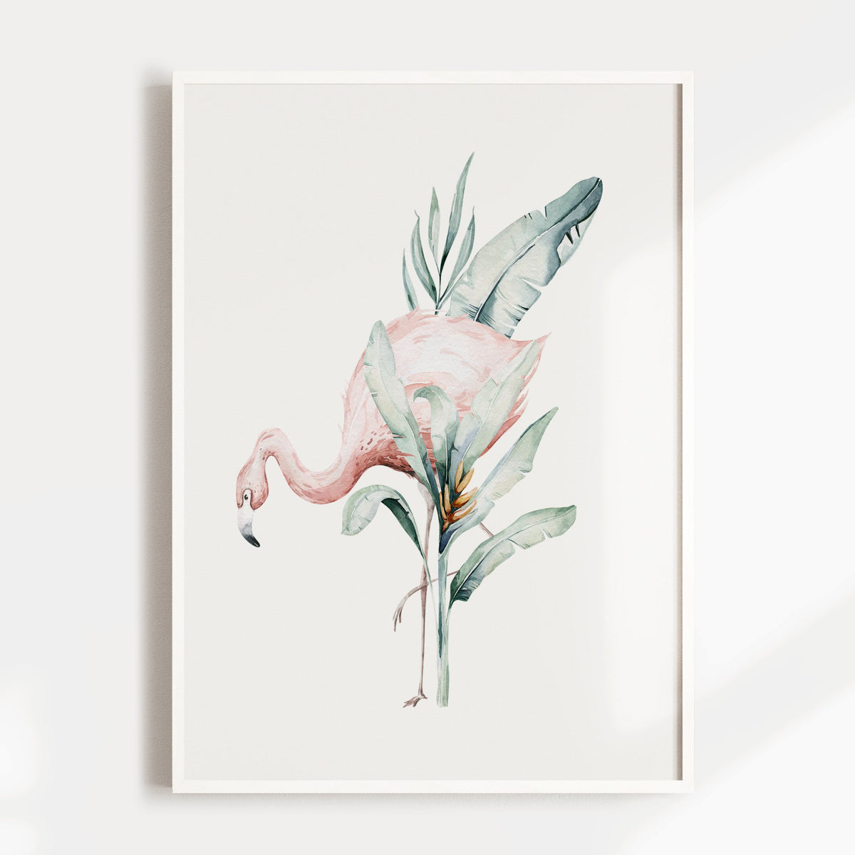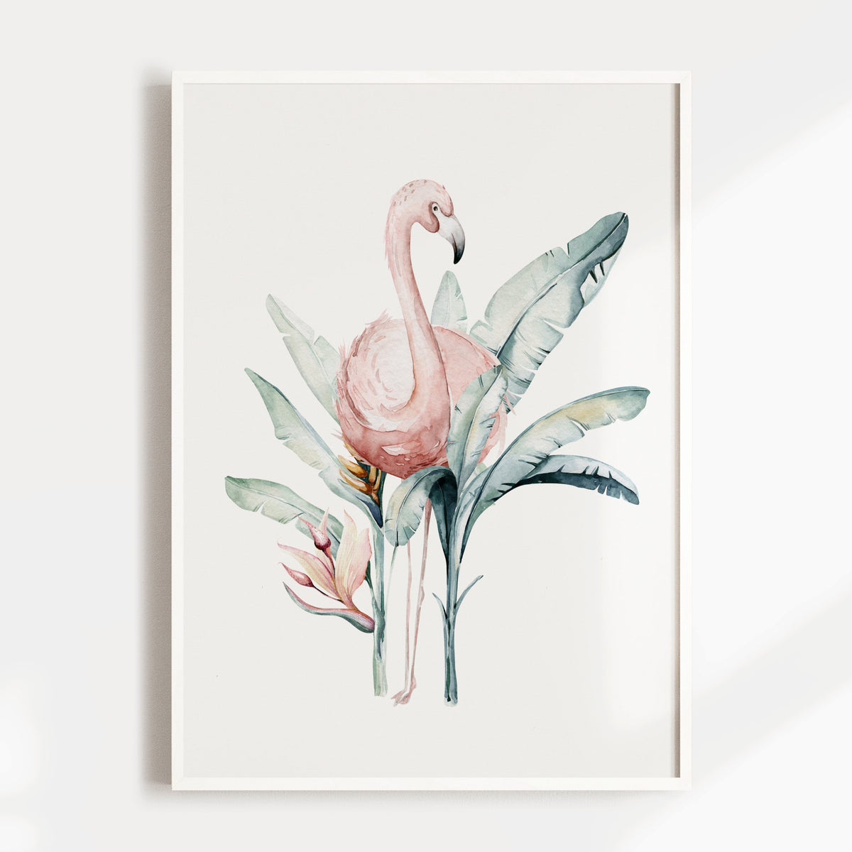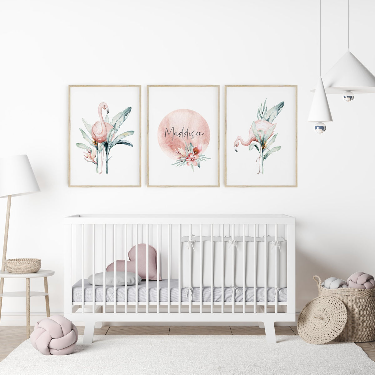 A beautiful addition to your child's nursery or bedroom is this set of 3 watercolour art prints, featuring two tropical flamingos nestled among greenery and a floral embellished name print.