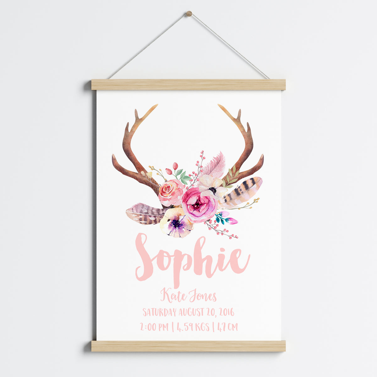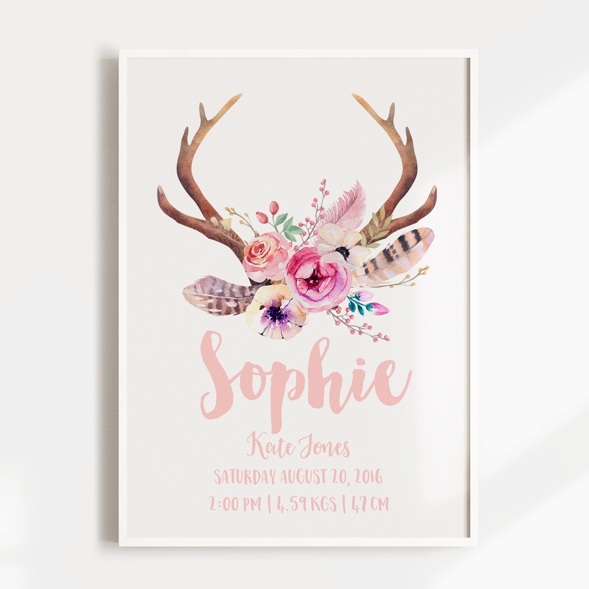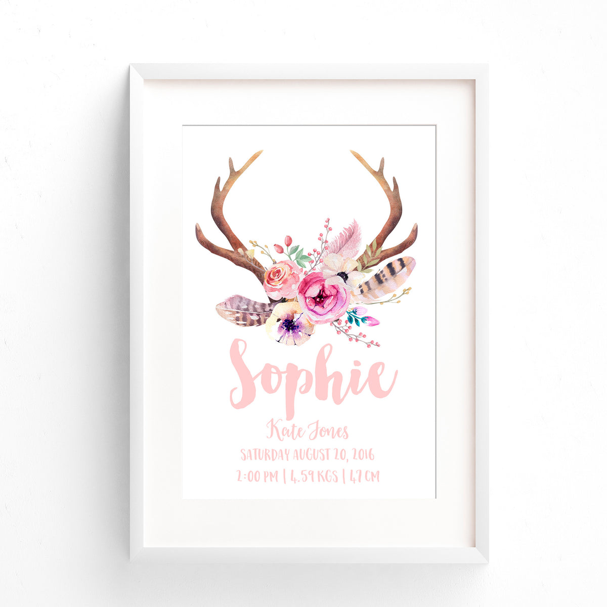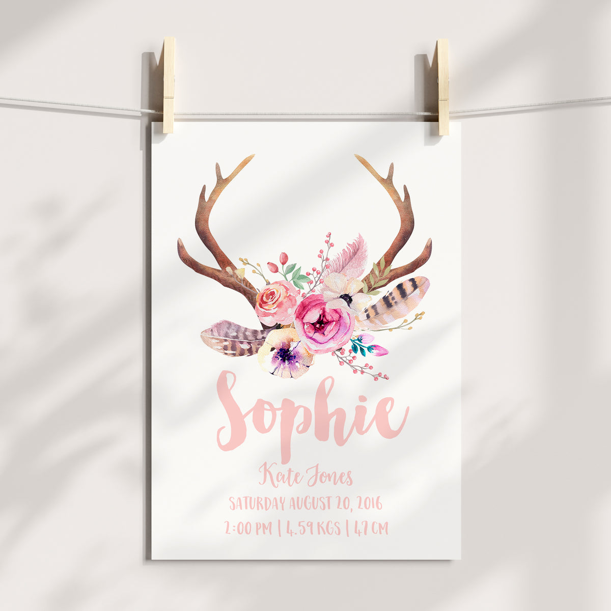 Unit price perA soft watercolour Boho Antler birth announcement print, customised with your child's details.