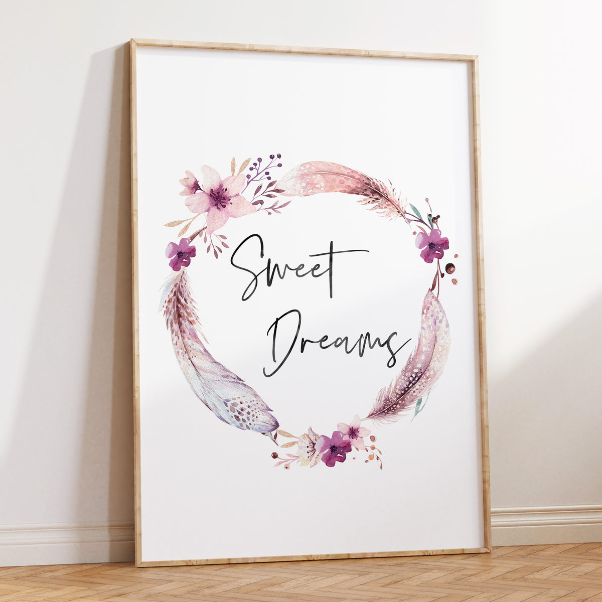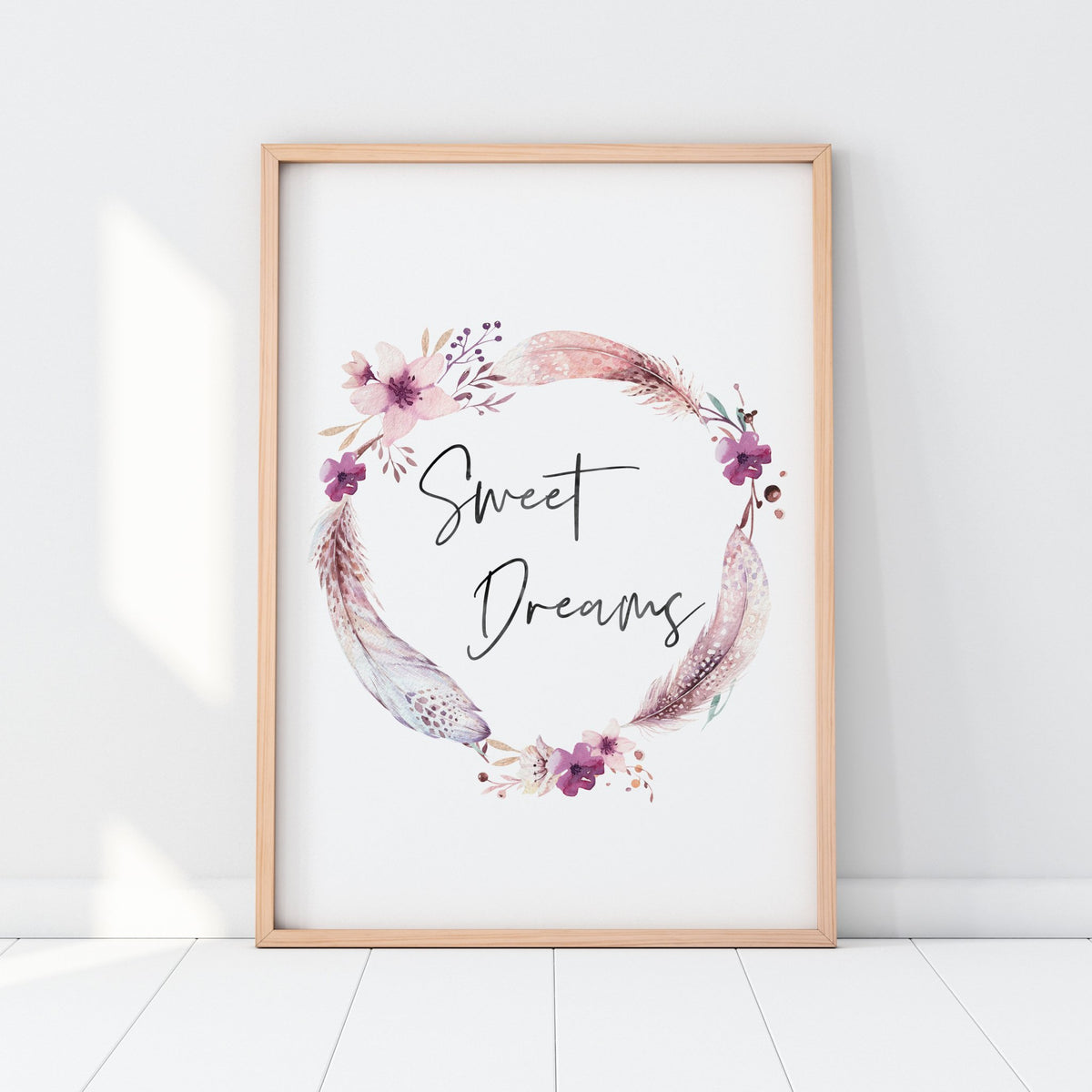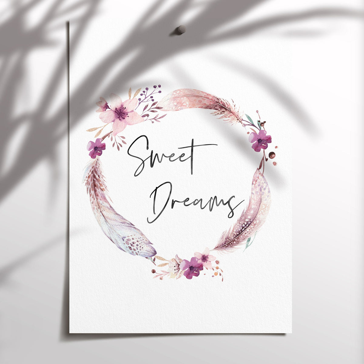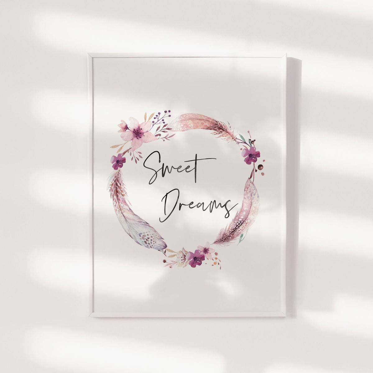 Unit price perOur feather & floral sweet dreams wreath wall art print is perfect for your little girls boho or woodland inspired nursery or bedroom decor.