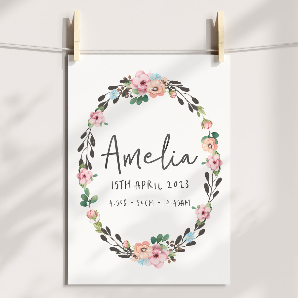 Designed to complement our floral ballet animal prints, this customised birth details print includes your child's details. Makes a perfect new baby gift.