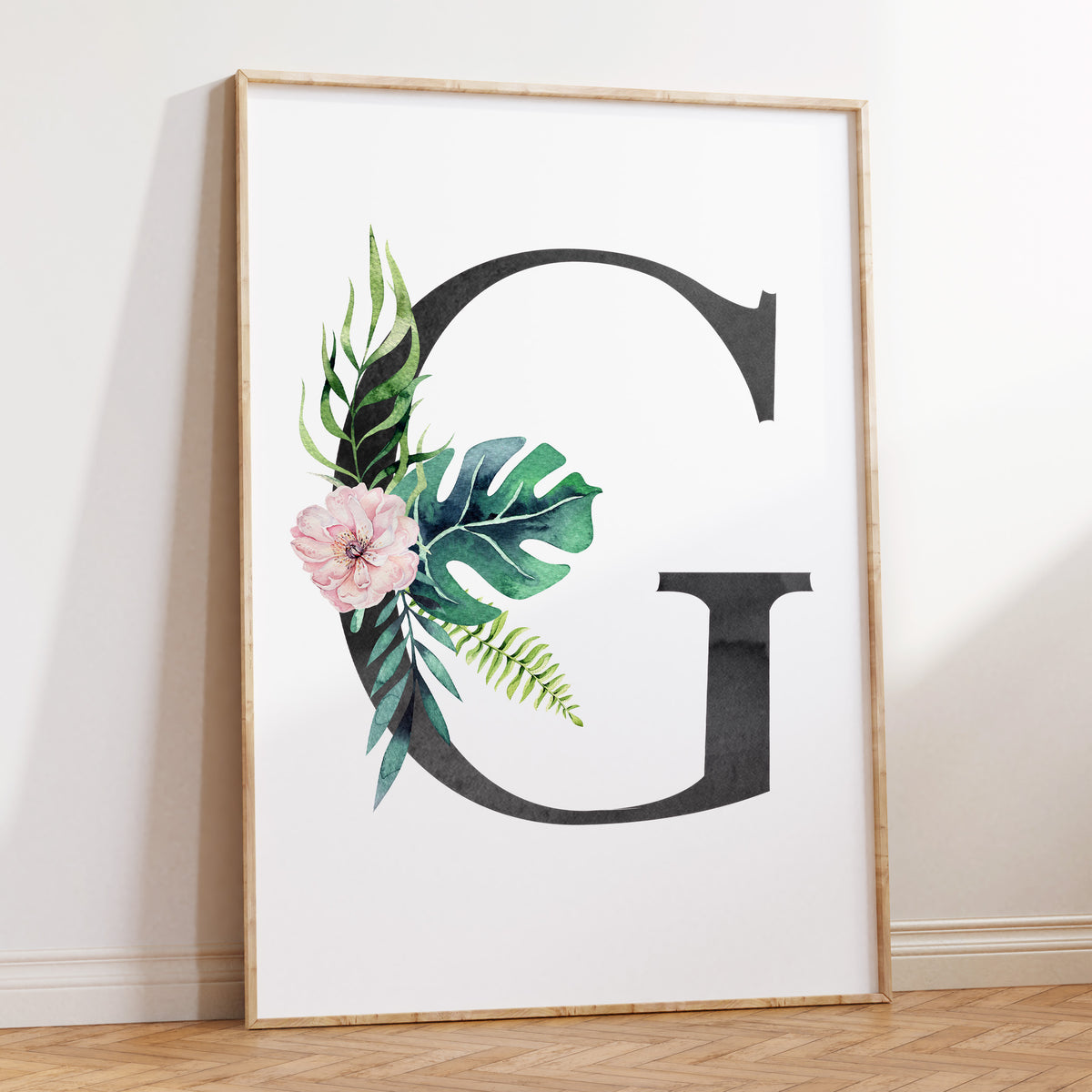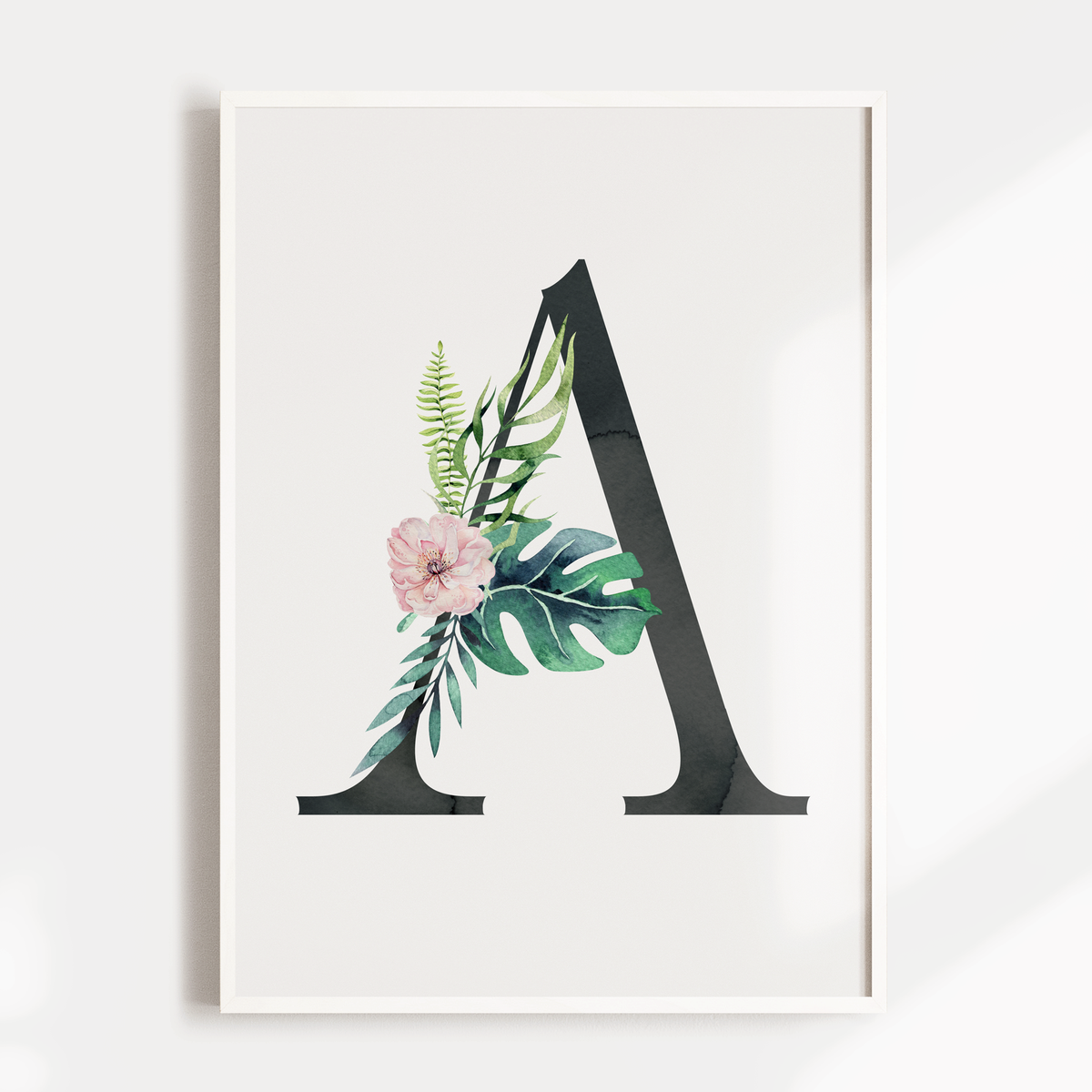 Unit price perA personalised monogram nursery wall art print, featuring jungle & tropical greenery. Customised with the first letter of your child's name and available in a variety of print & poster sizes for easy do it yourself framing.