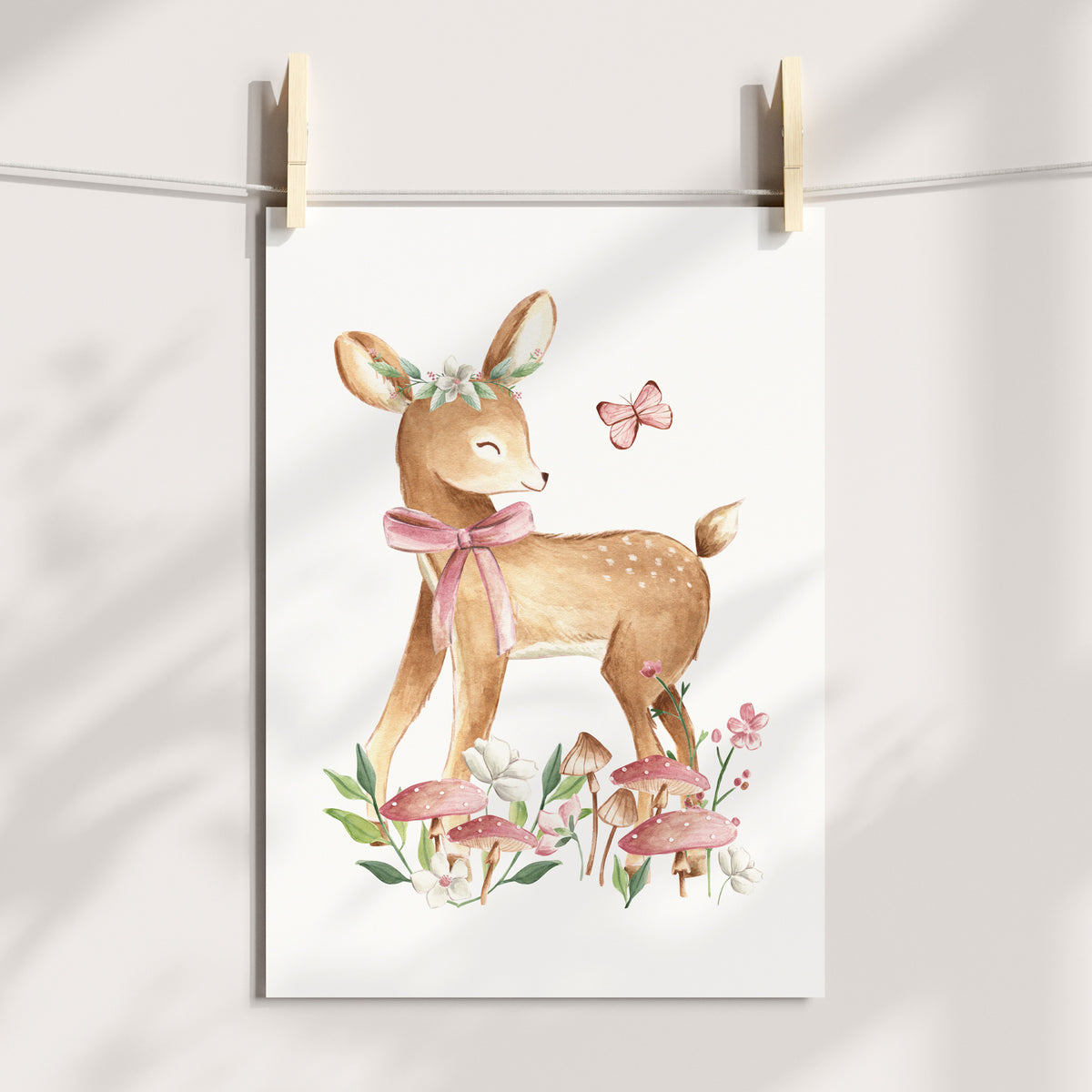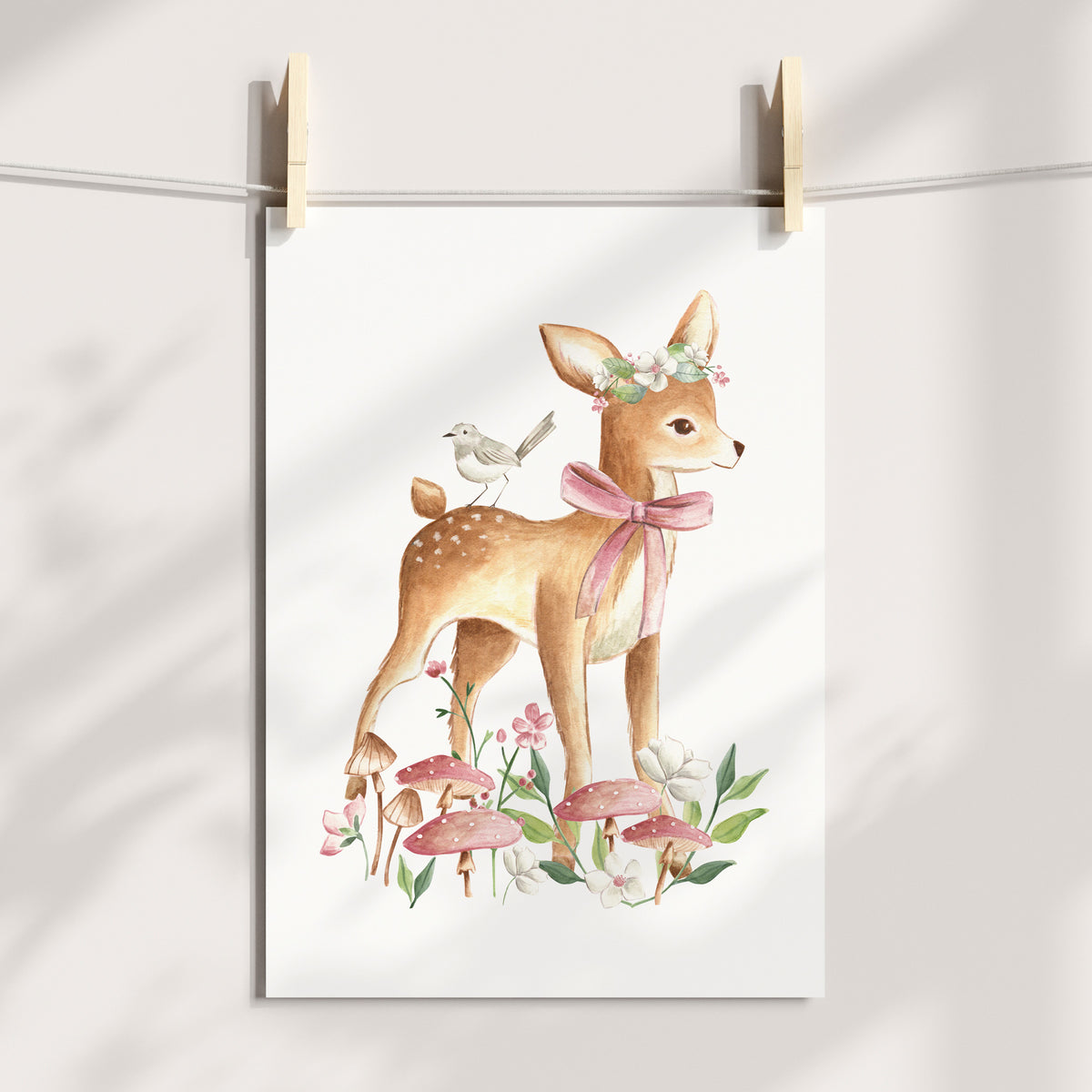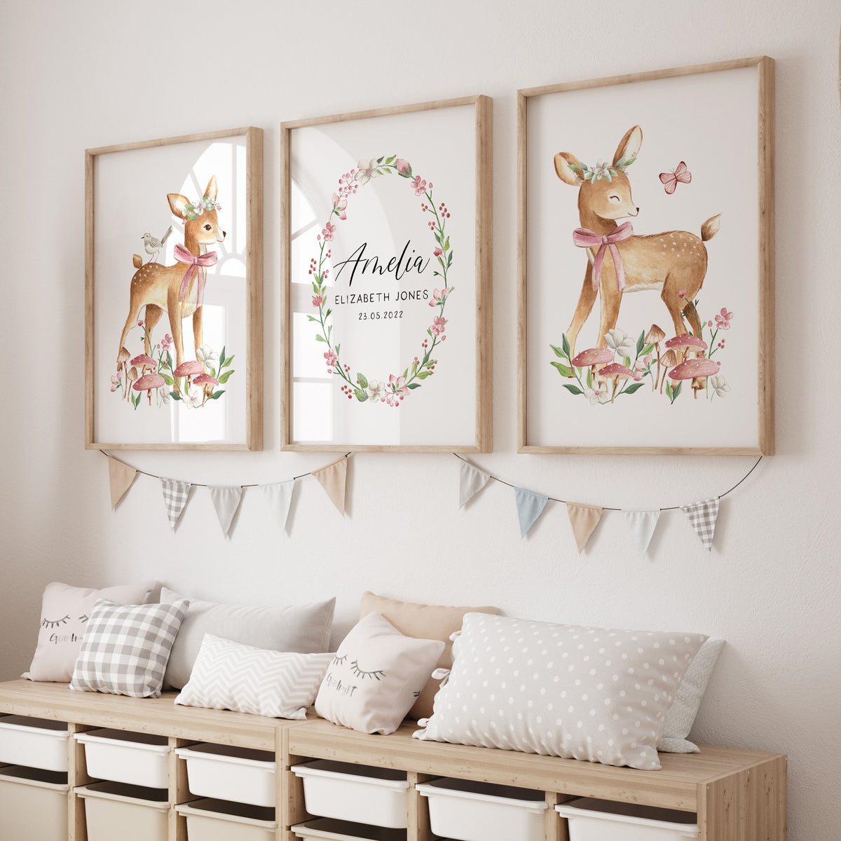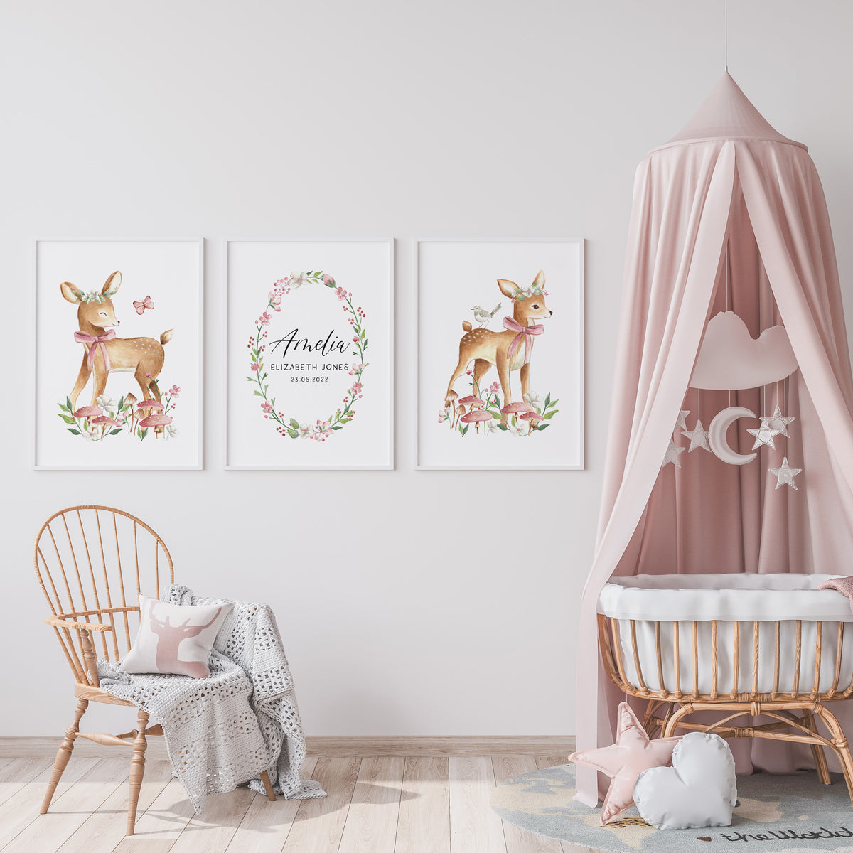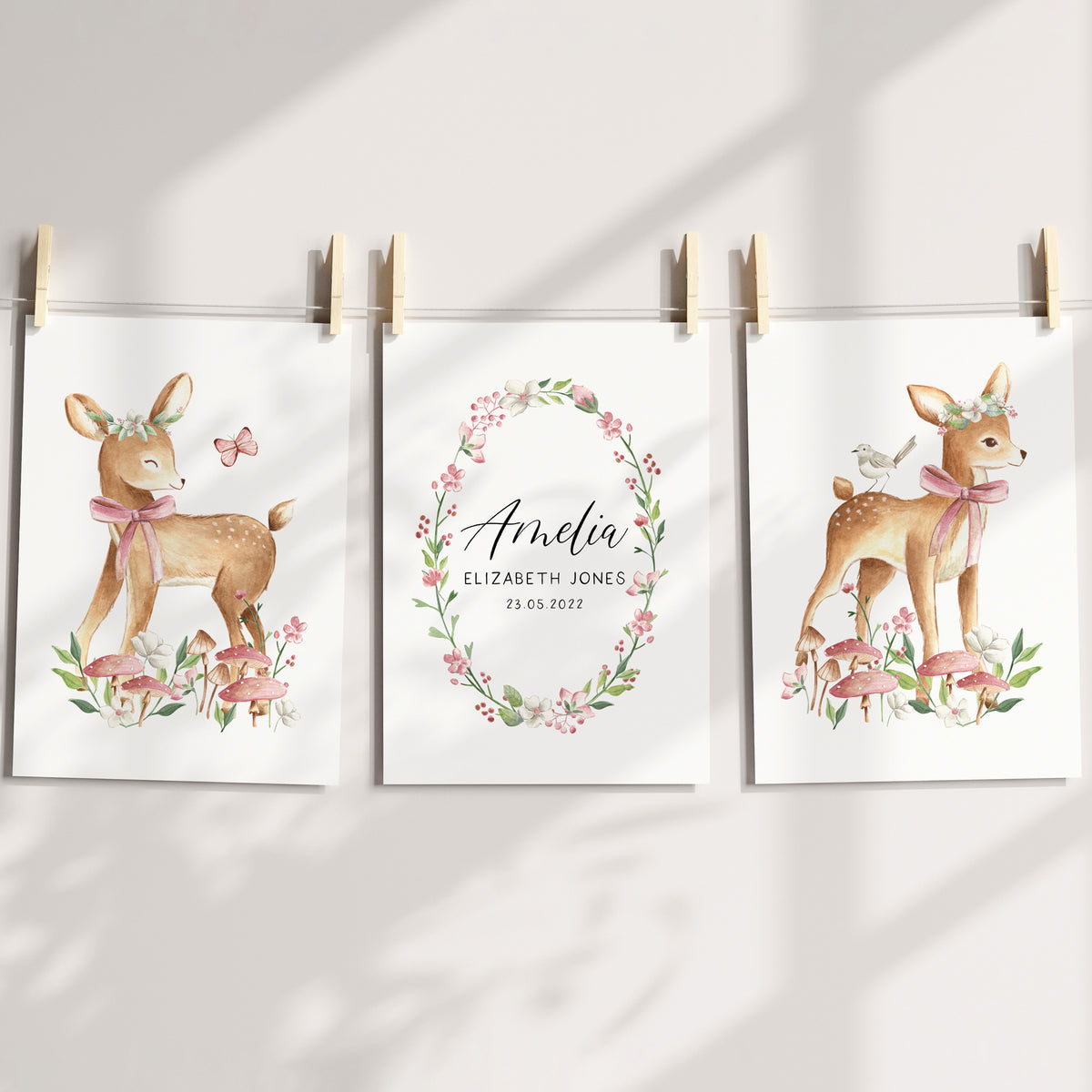 Perfect for the woodland animal themed nursery, bedroom or playroom, this set of 3 prints includes two baby deer prints & a personalised birth print.