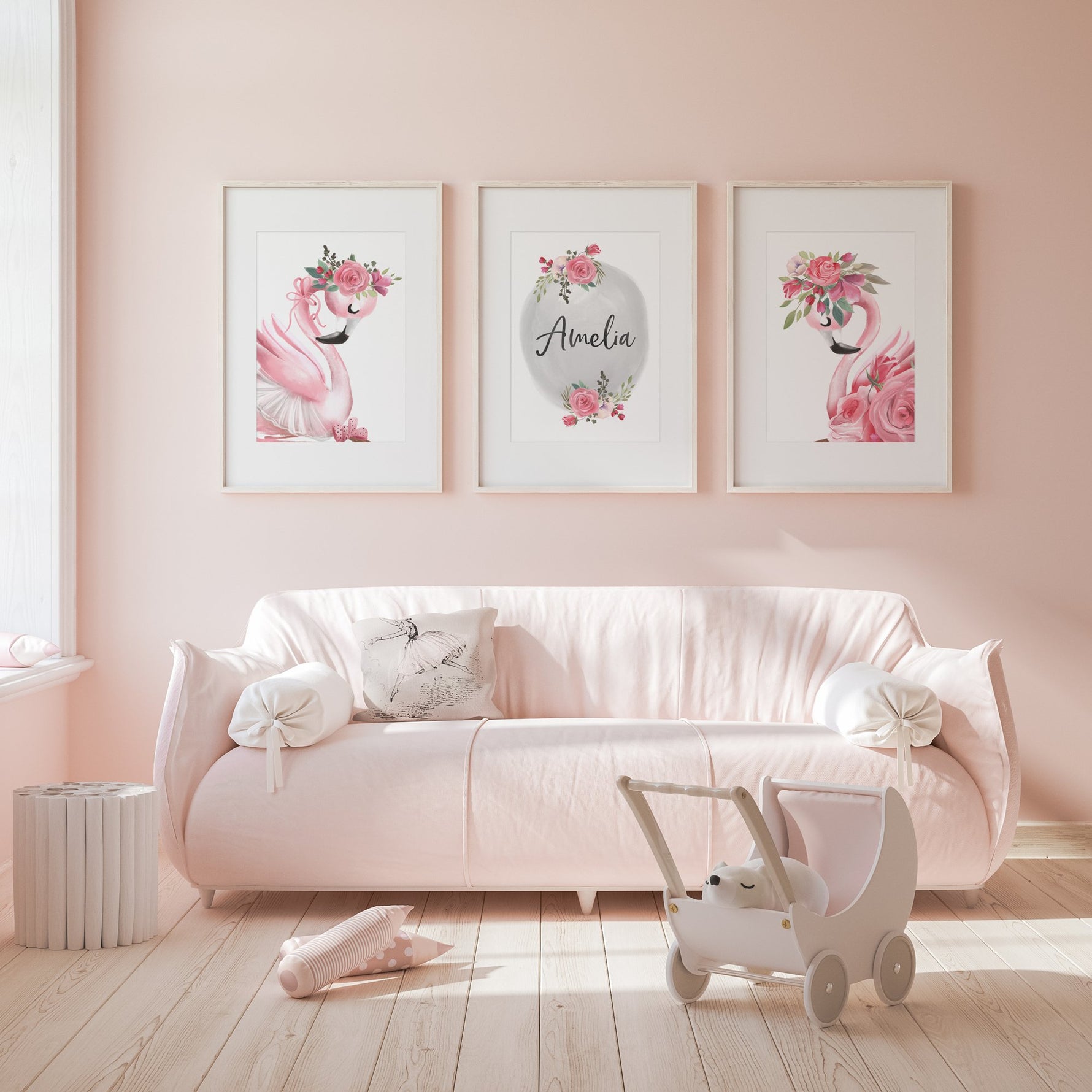 A set of three watercolour, ballet inspired nursery wall art prints, featuring two floral flamingos in tutu's and a personalised name print. A perfect new baby gift or add the finishing touches your own little girls bedroom or playroom decor.