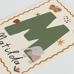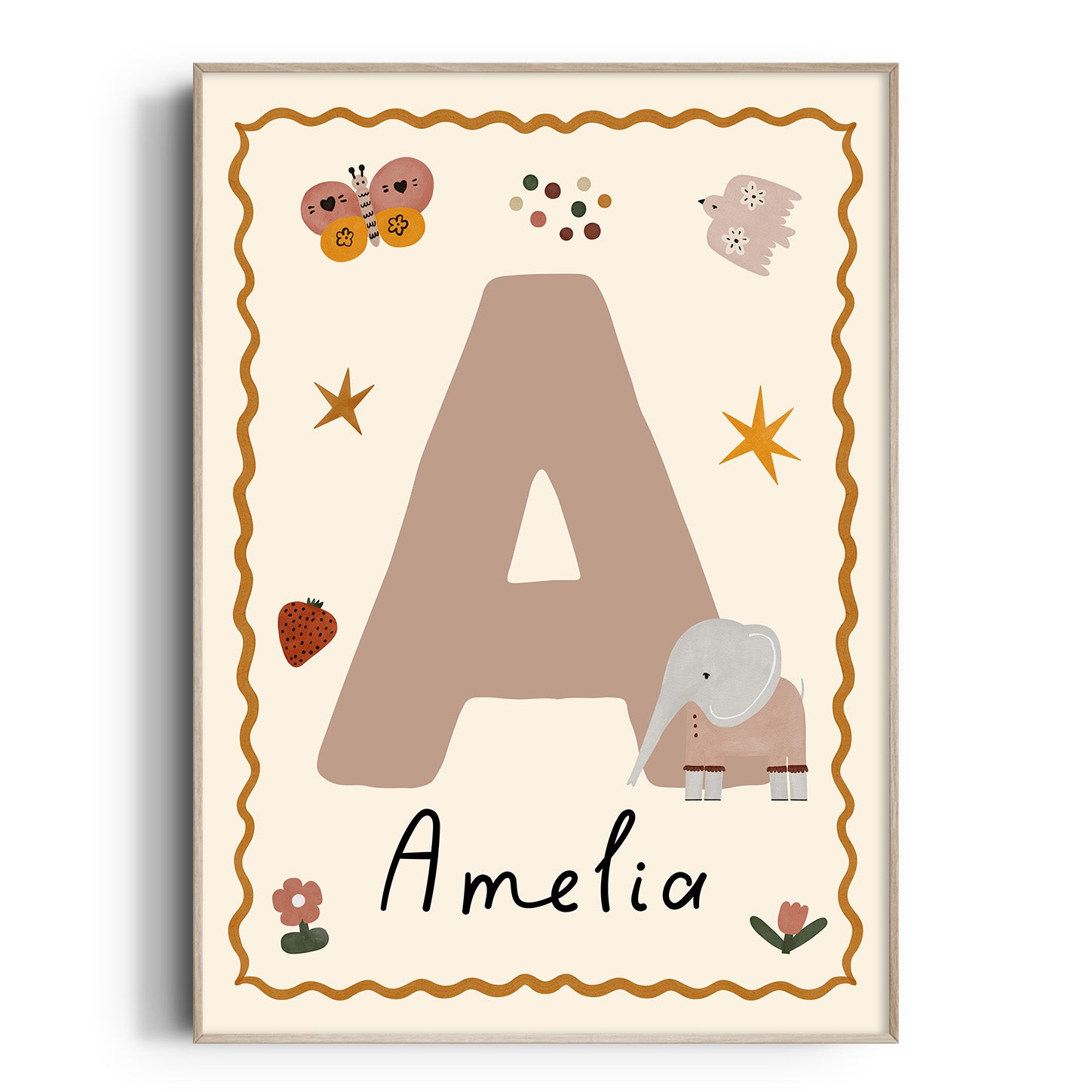 Bring charm and sweetness to your little one’s space with this personalised nursery print, featuring your choice of letter and surrounded by whimsical details — a friendly elephant, a smiling butterfly, golden stars, and soft floral accents.