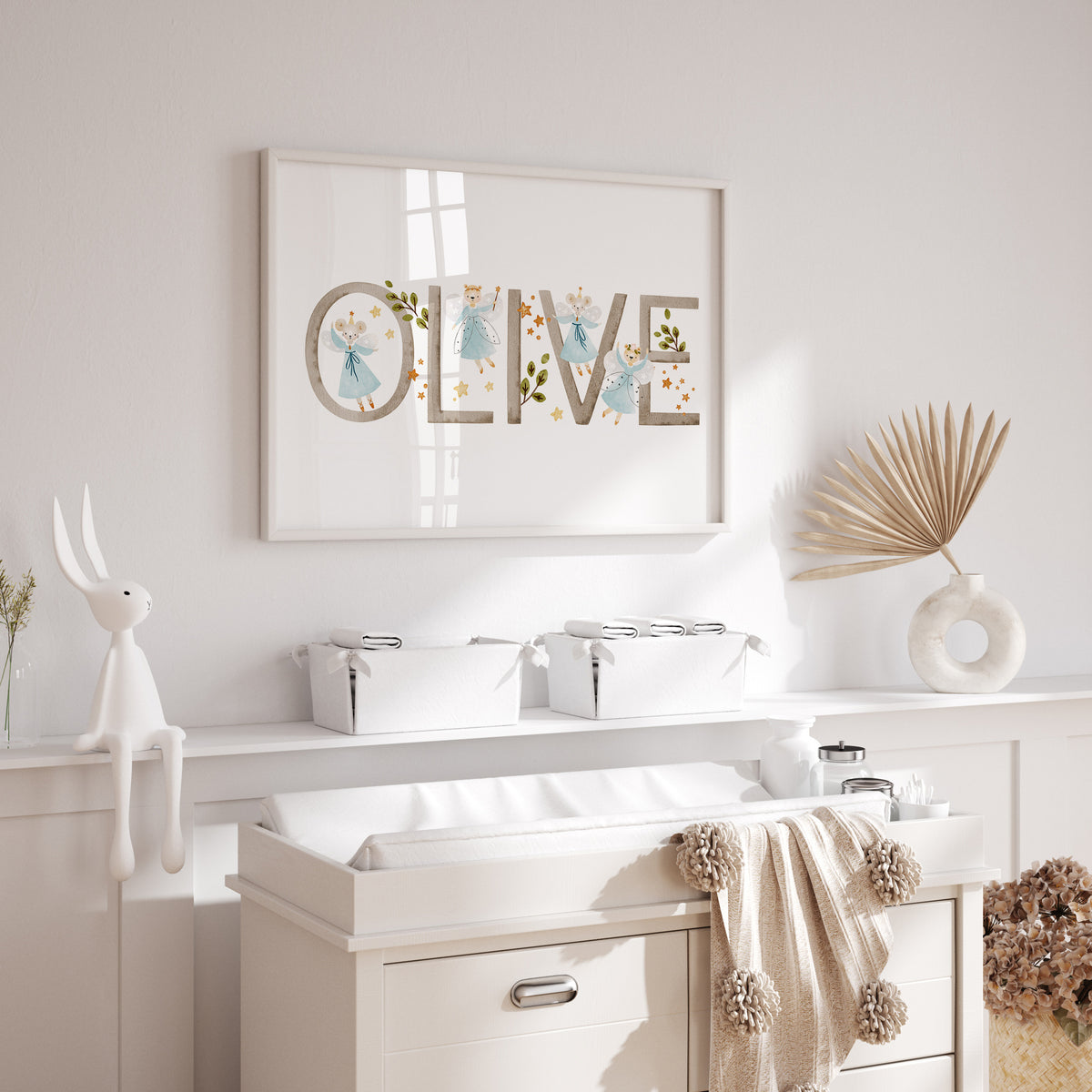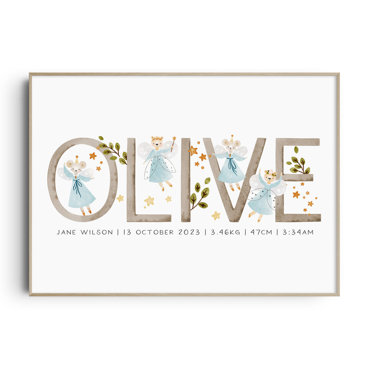 This magical personalised fairy mouse & bear name & birth details print is available with your choice of details. It will make a perfect new baby gift or simply add the finishing touches to your own little girl's nursery, bedroom or playroom decor.
