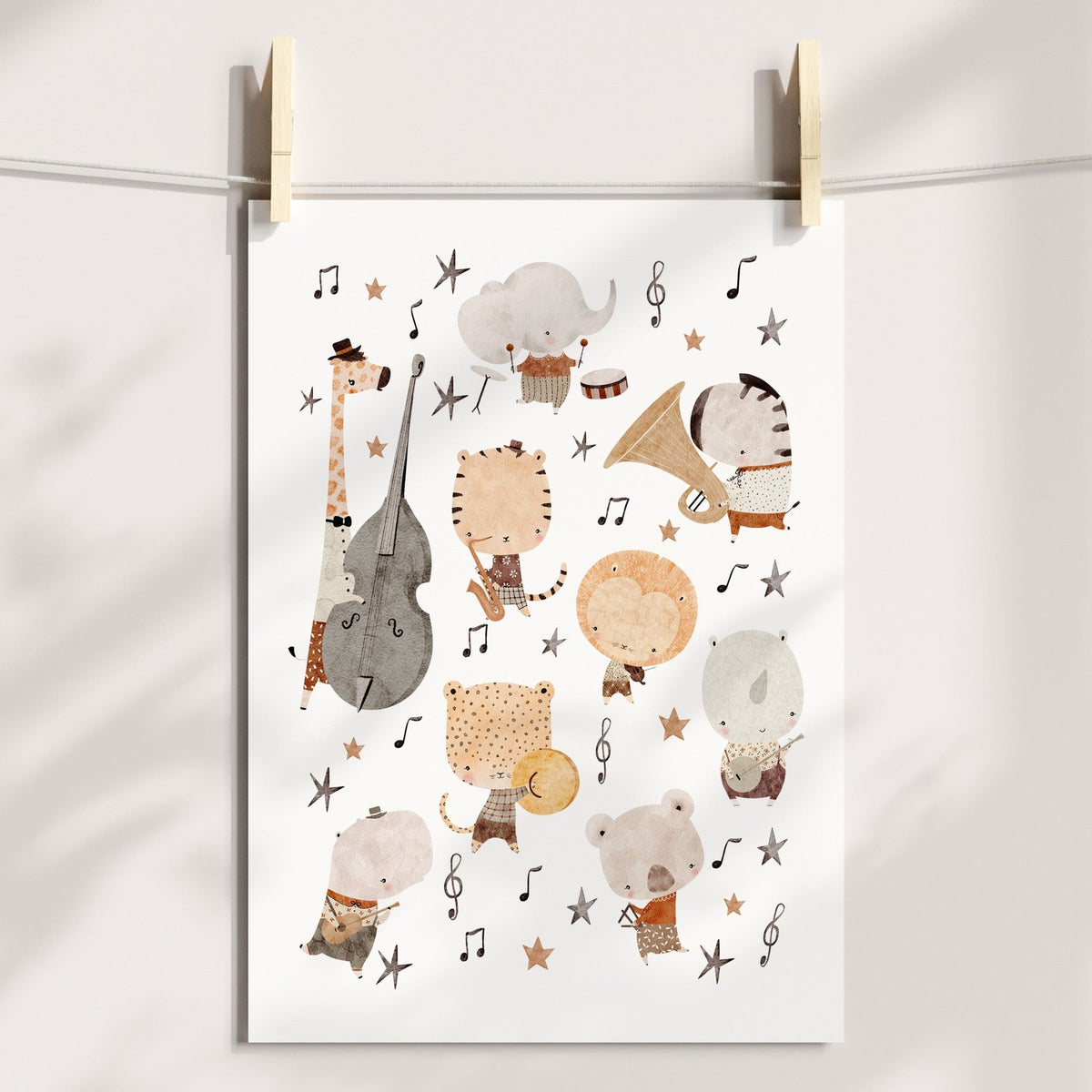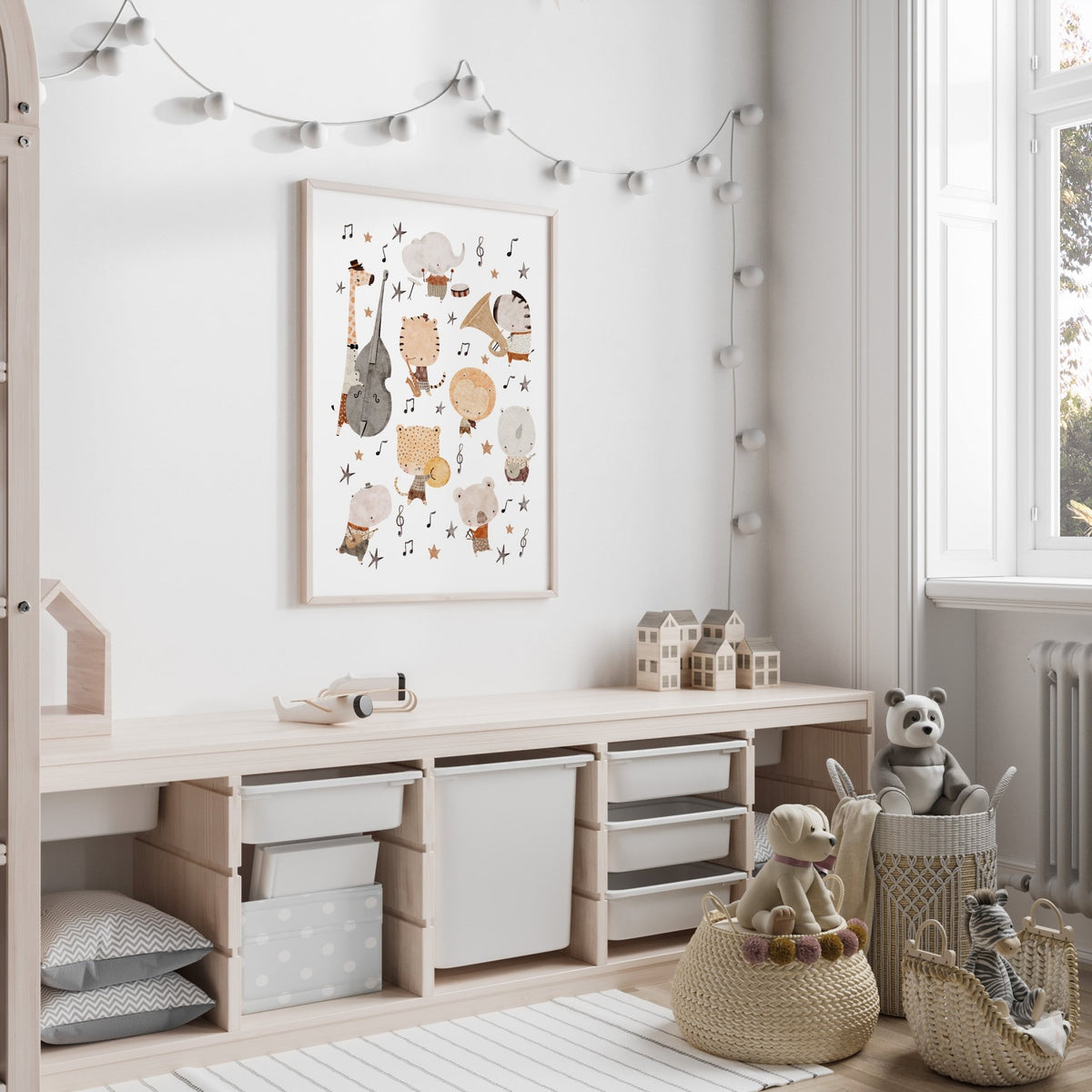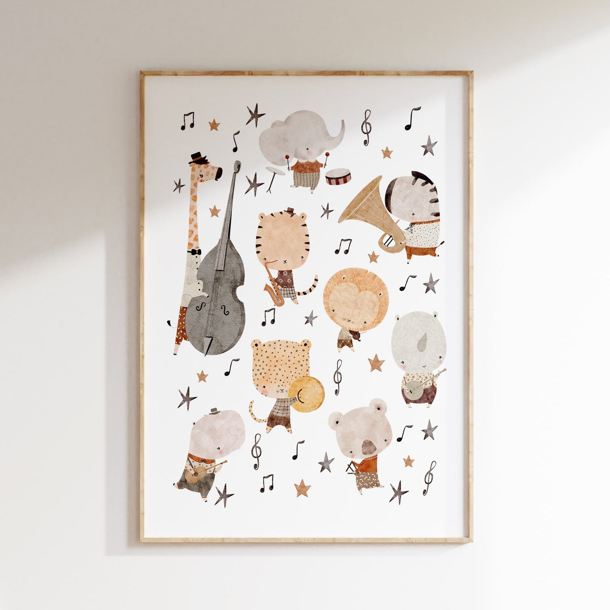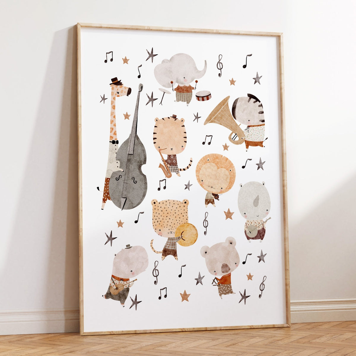 Unit price perThe perfect addition to the music or animal themed nursery, bedroom or playroom decor is this jungle jazz animals wall art print. Featuring a variety of safari animals playing musical instruments, this print is sure to please any little music lover.