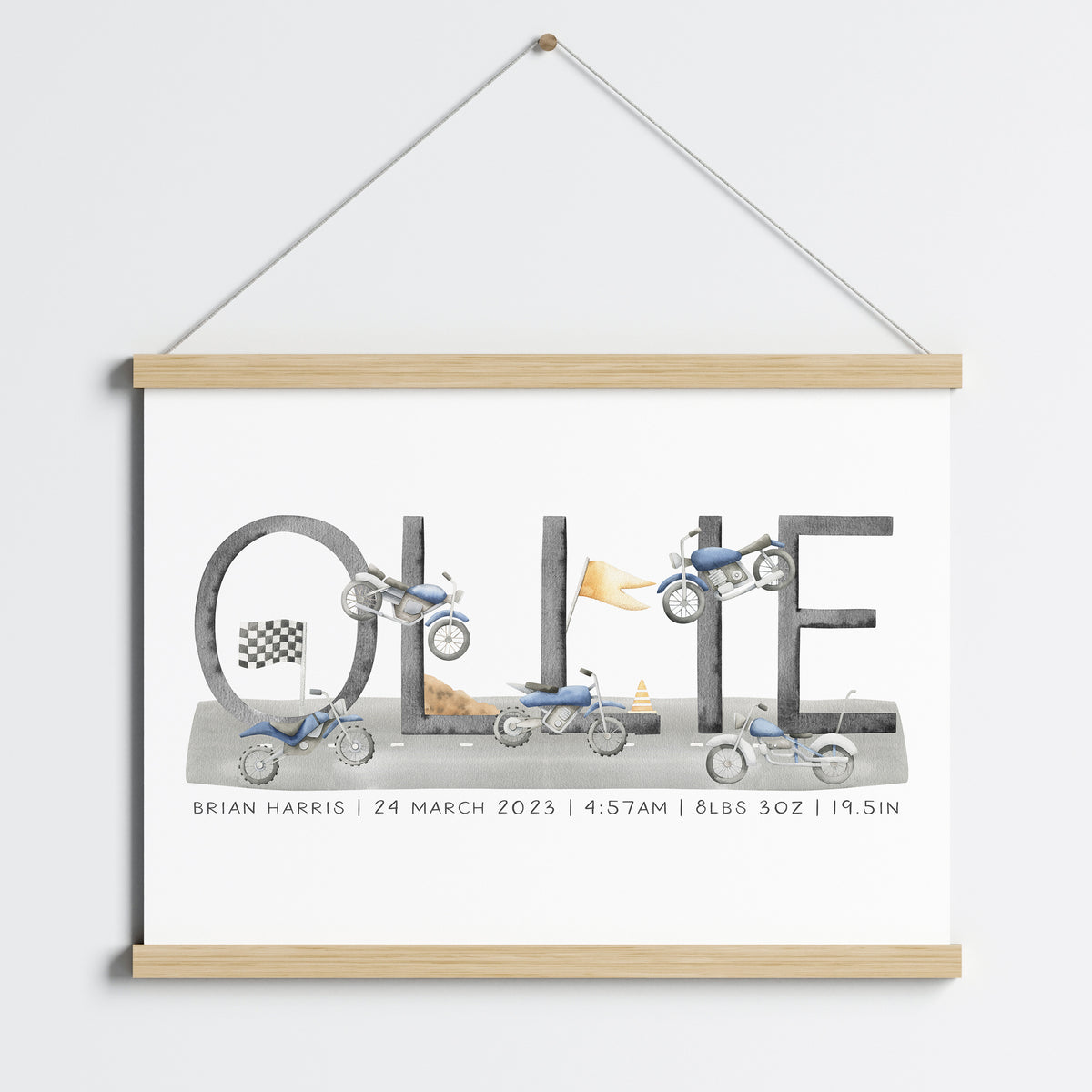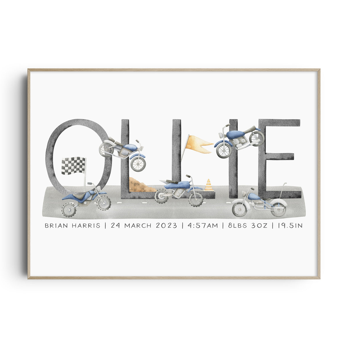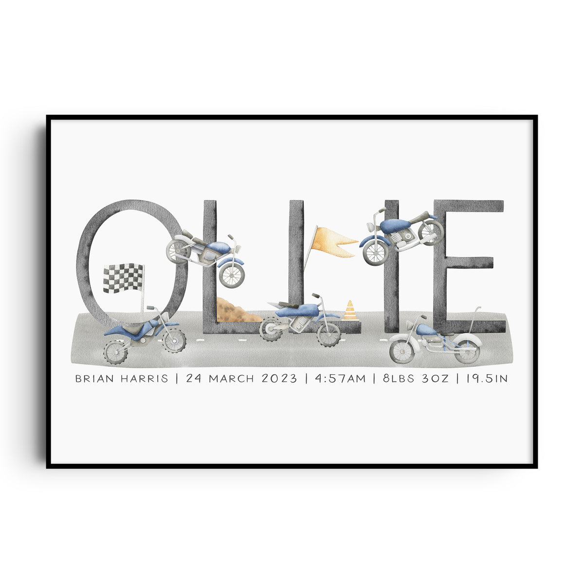Unit price perPerfect for the transportation or motorbike themed nursery, bedroom or playroom this personalised name print makes a great new baby gift or add the finishing to touches to your own little boy's space.