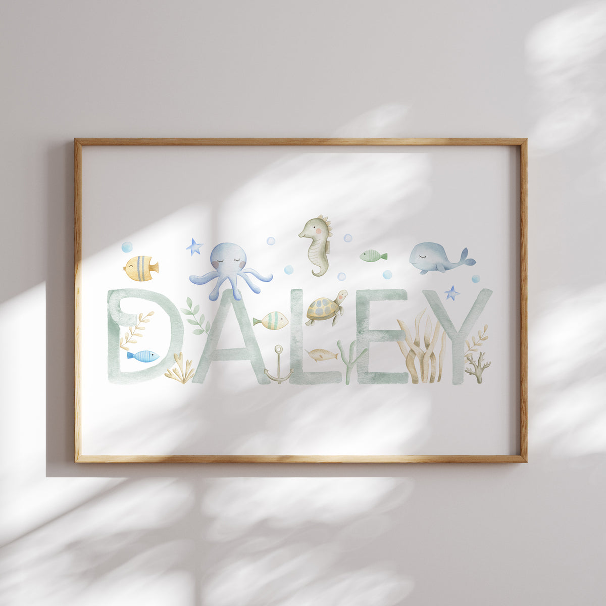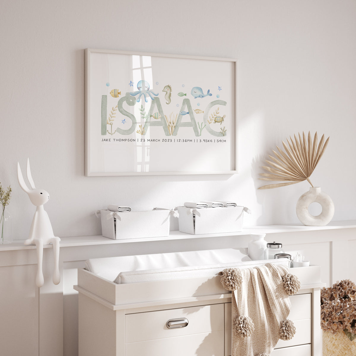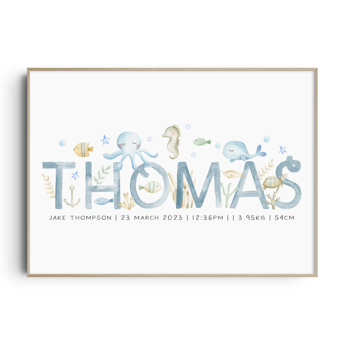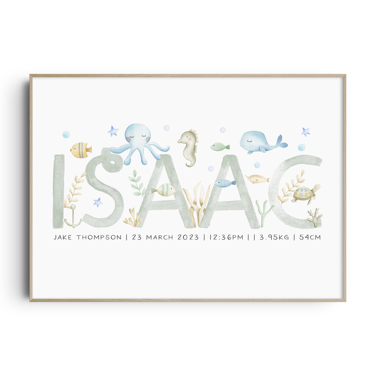 Unit price perPerfect for the sea or ocean themed nursery, this personalised baby name print features under the sea animals, along with the option to add your little one's birth details, it makes a perfect new baby gift or add the finishing touches to your own little boy's room.