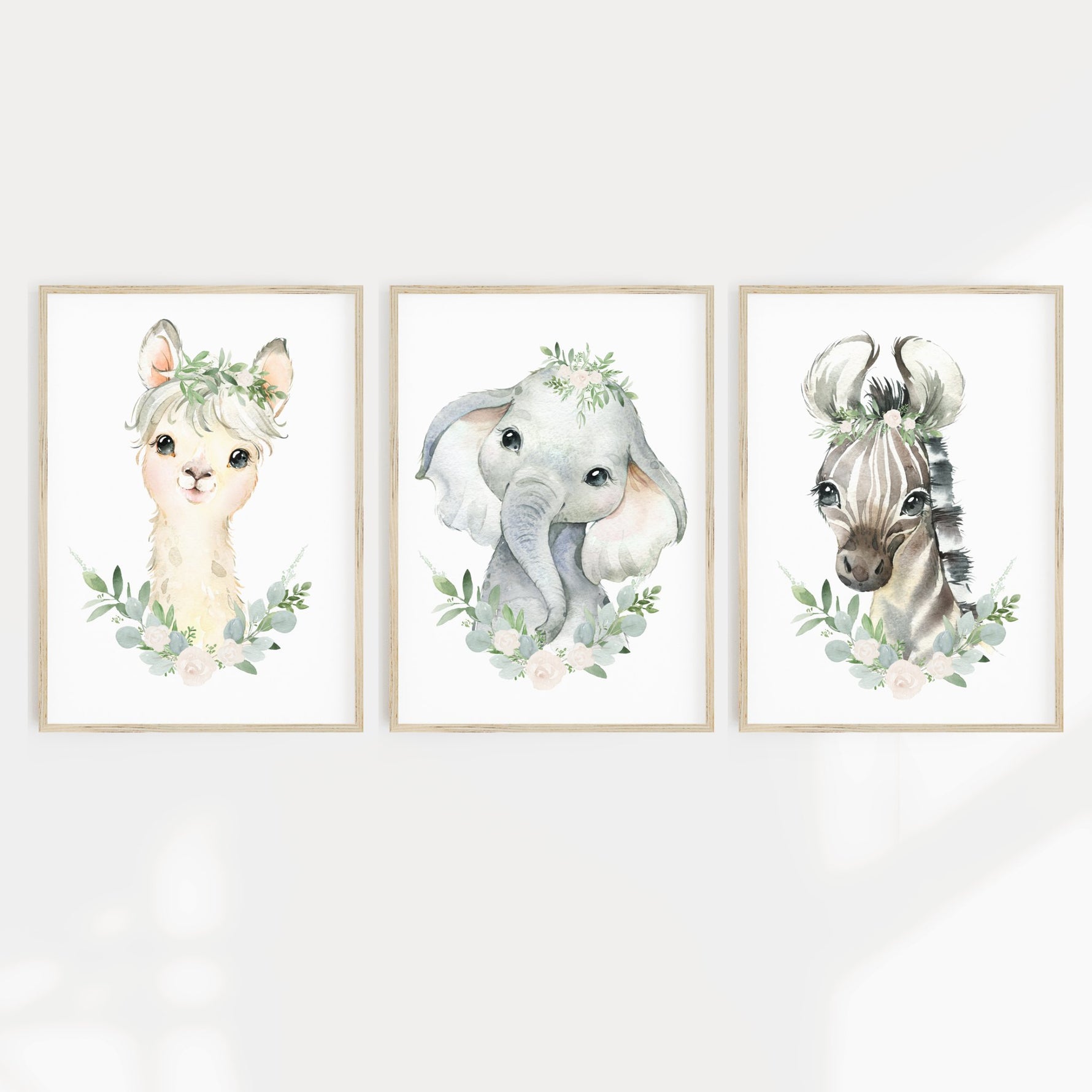 A woodland, safari nursery or bedroom wall art print set includes an elephant, zebra and llama print.