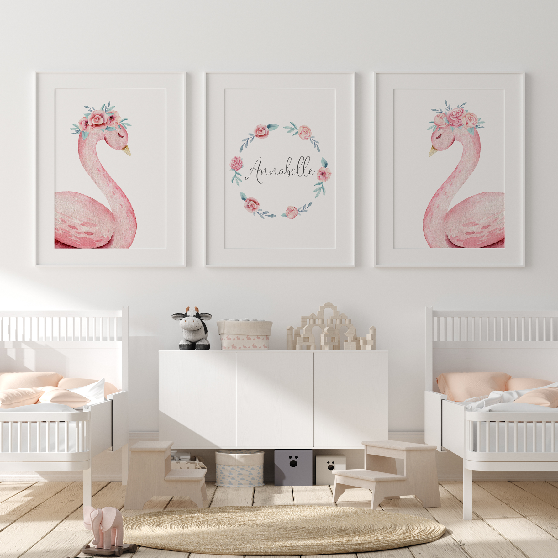 A set of 3 prints including two pink watercolour swans and a complimentary floral wreath name print, personalised with your child's details.