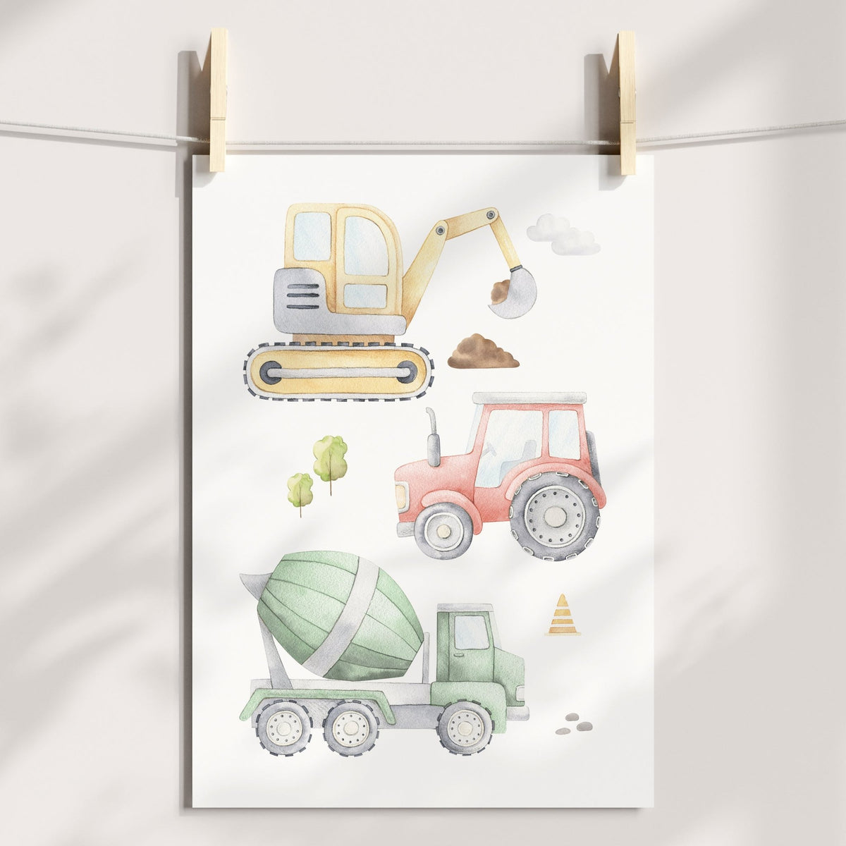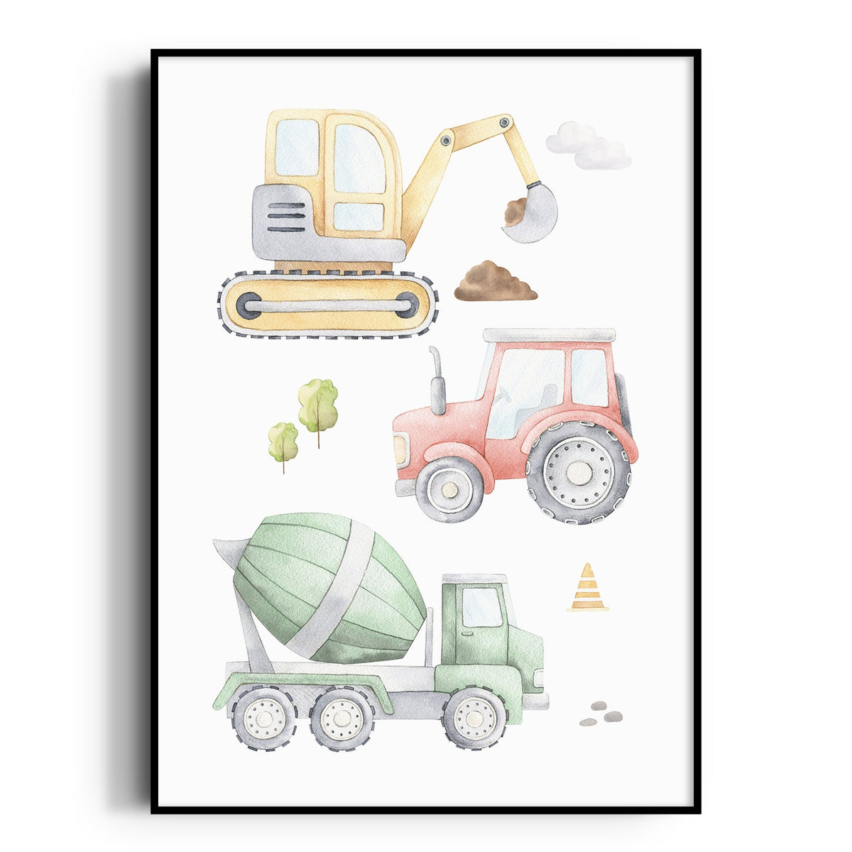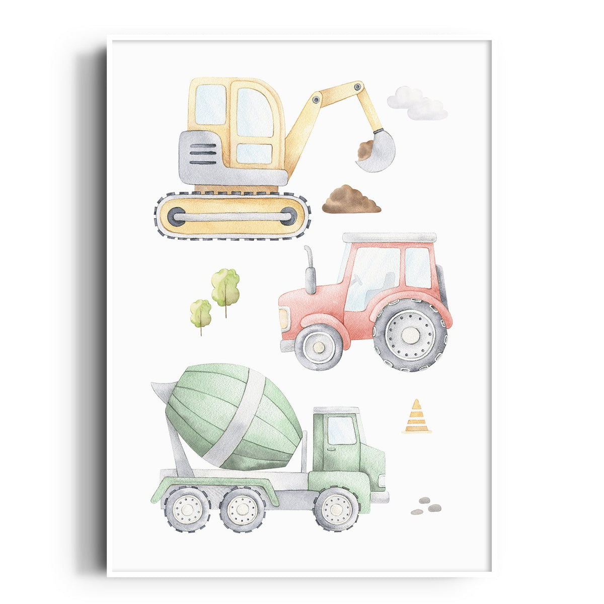 Unit price perThis fun truck construction vehicle art print, featuring an excavator, cement truck, & tractor makes a perfect new baby boy gift, or a great way to add the finishing touches to your own child's nursery or bedroom space.