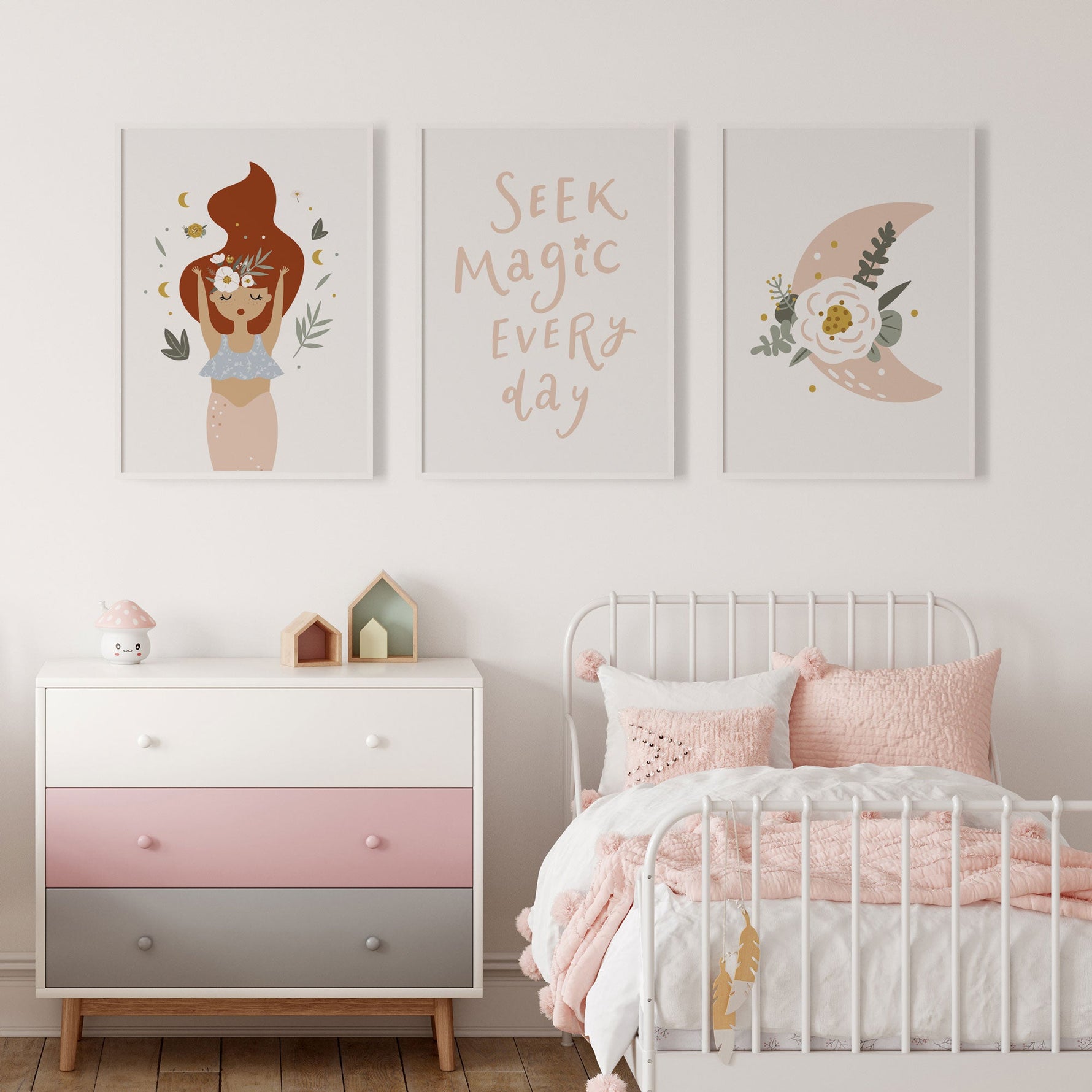 A beautiful addition to your child's nursery or bedroom is this set of 3 boho art prints, featuring a floral mermaid, moon & motivational quote print.