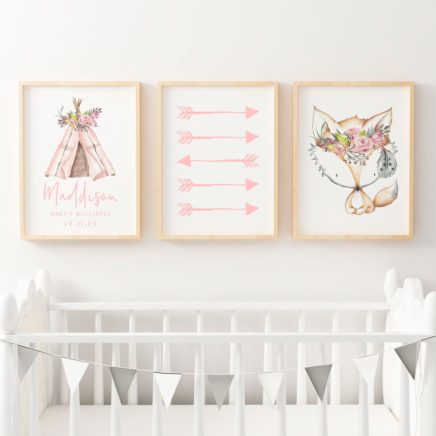 Featuring soft hints of watercolour pinks, this tribal boho woodland nursery or bedroom wall art print set includes a floral fox print, pink arrows and a personalised teepee birth print.