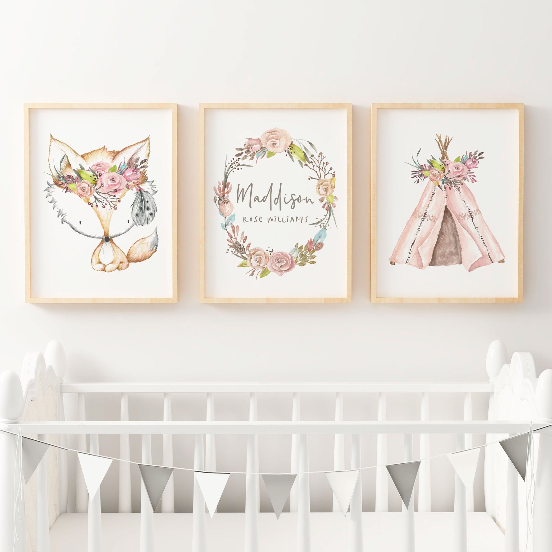 Featuring soft hints of watercolour pinks, this tribal boho woodland nursery or bedroom wall art print set includes a floral fox print, a woodland teepee and a personalised floral wreath name print.