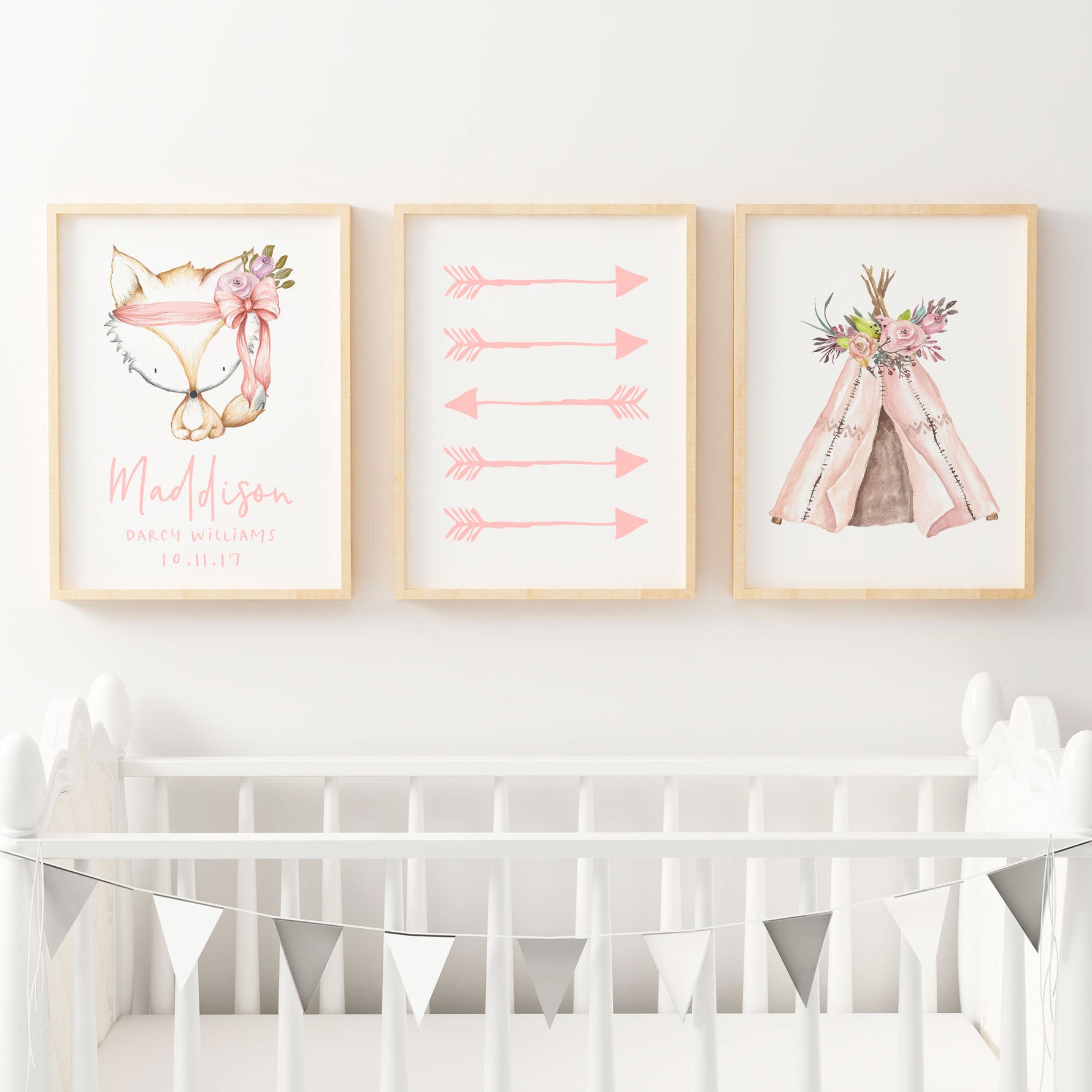 Featuring soft hints of watercolour pinks, this tribal boho woodland nursery or bedroom wall art print set includes a floral teepee print, pink arrows and a personalised fox birth print.