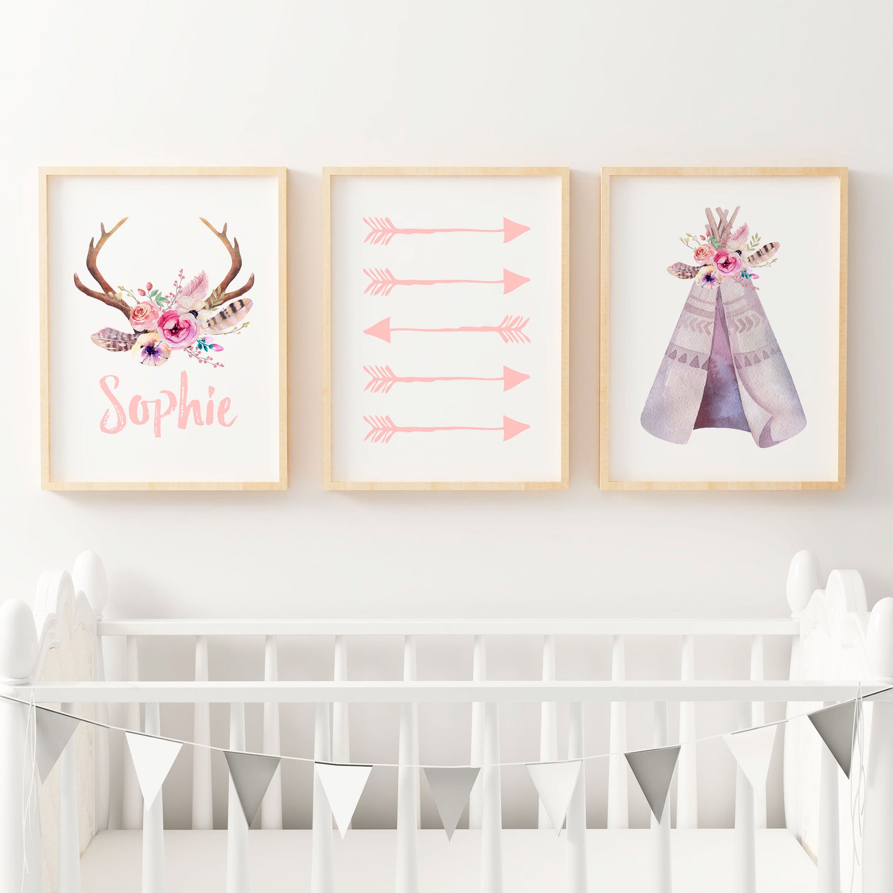 A boho nursery wall art print set that includes a floral watercolour teepee print, a pink arrows print and a personalised floral antler name print.