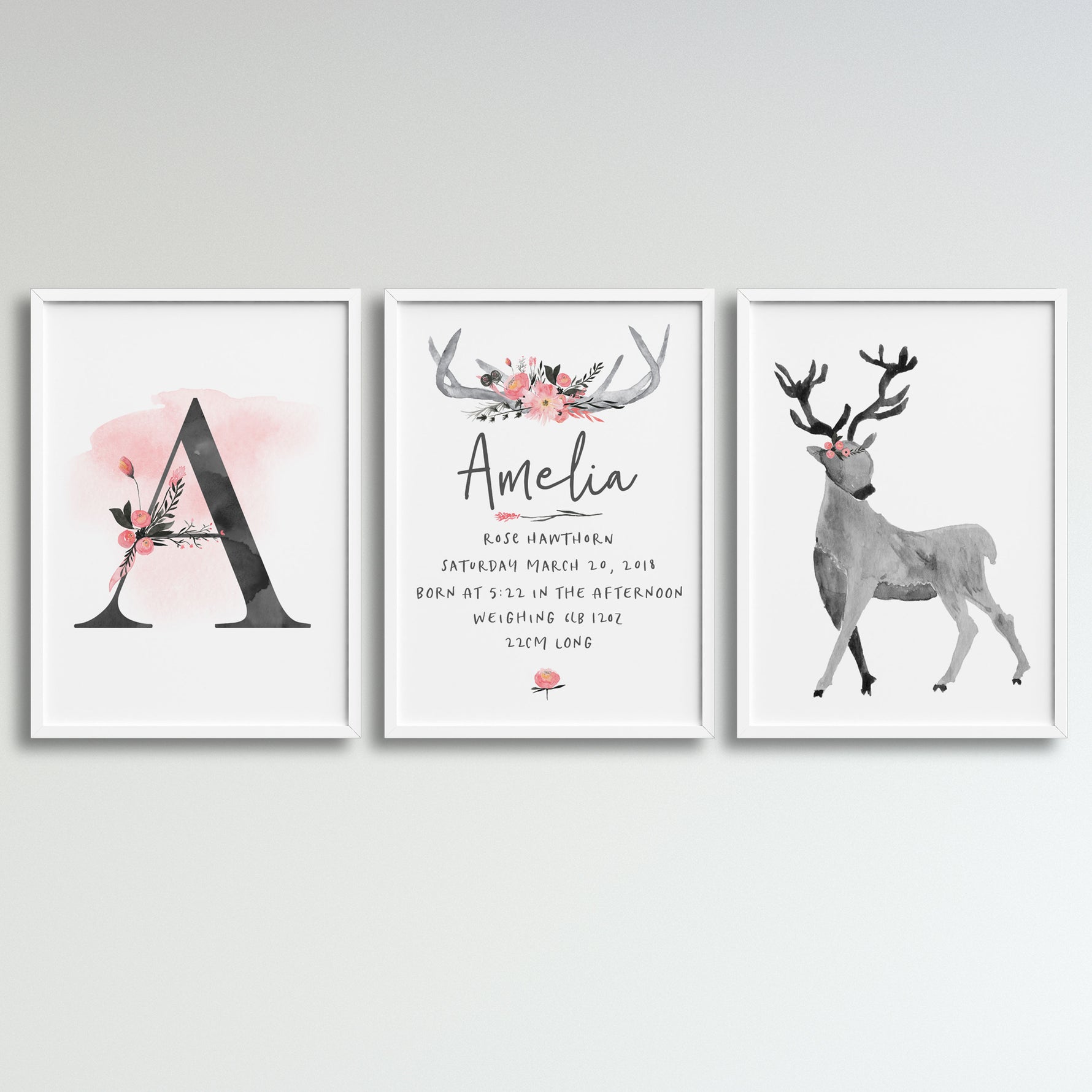 This set of three prints features a customised birth print, a woodland deer print and customised letter print, all complimented with floral accents.
