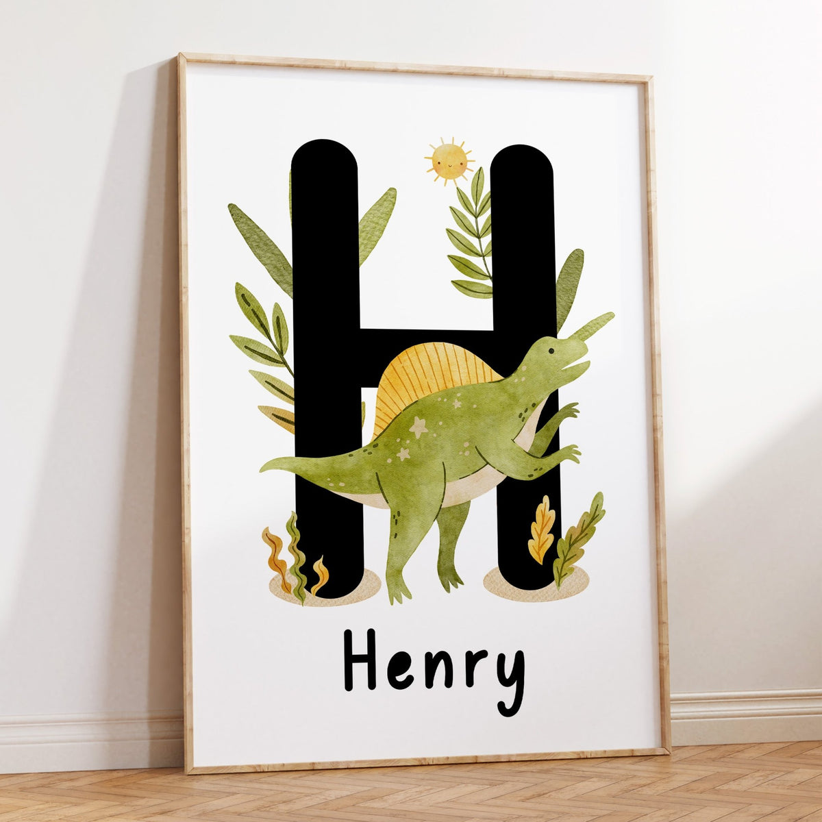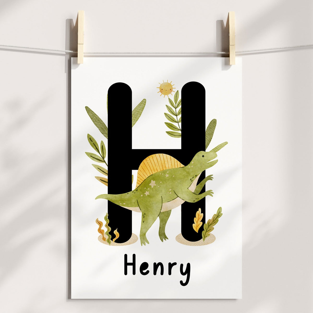 Unit price perThe perfect addition to the prehistoric themed nursery, bedroom or playroom decor is this personalised dinosaur name wall art print featuring a prehistoric spinosaurus.