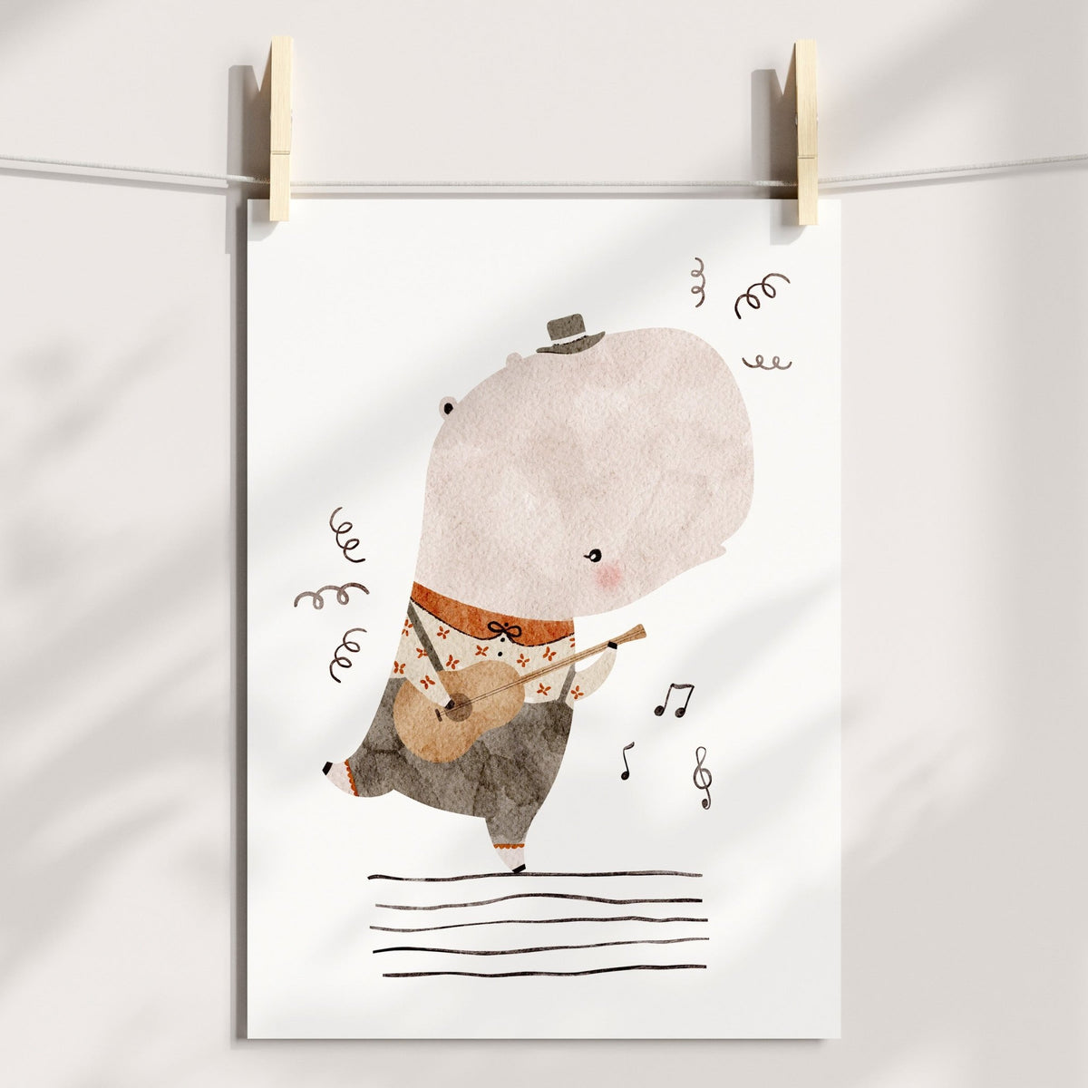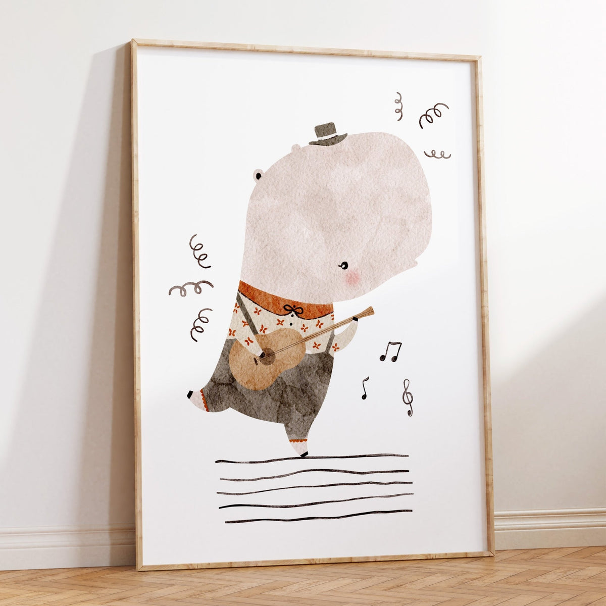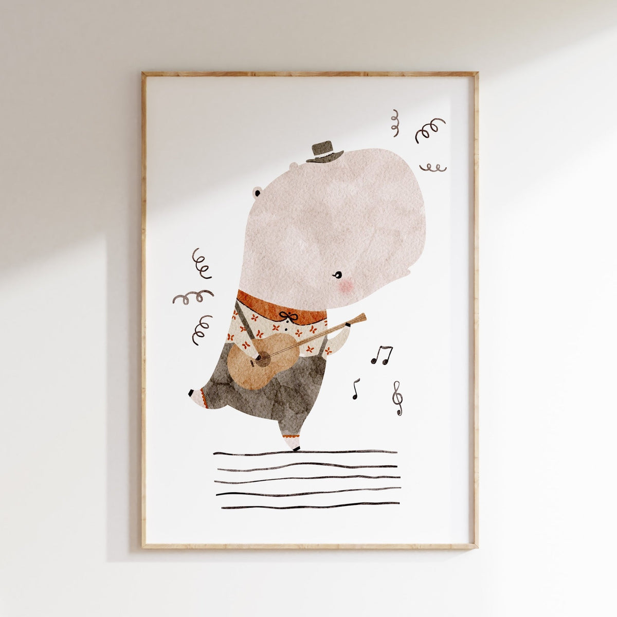 Unit price perThe perfect addition to the music or animal themed nursery, bedroom or playroom decor is this jungle jazz elephant wall art print. Featuring a safari hippo playing the guitar, this print is sure to please any little music lover.