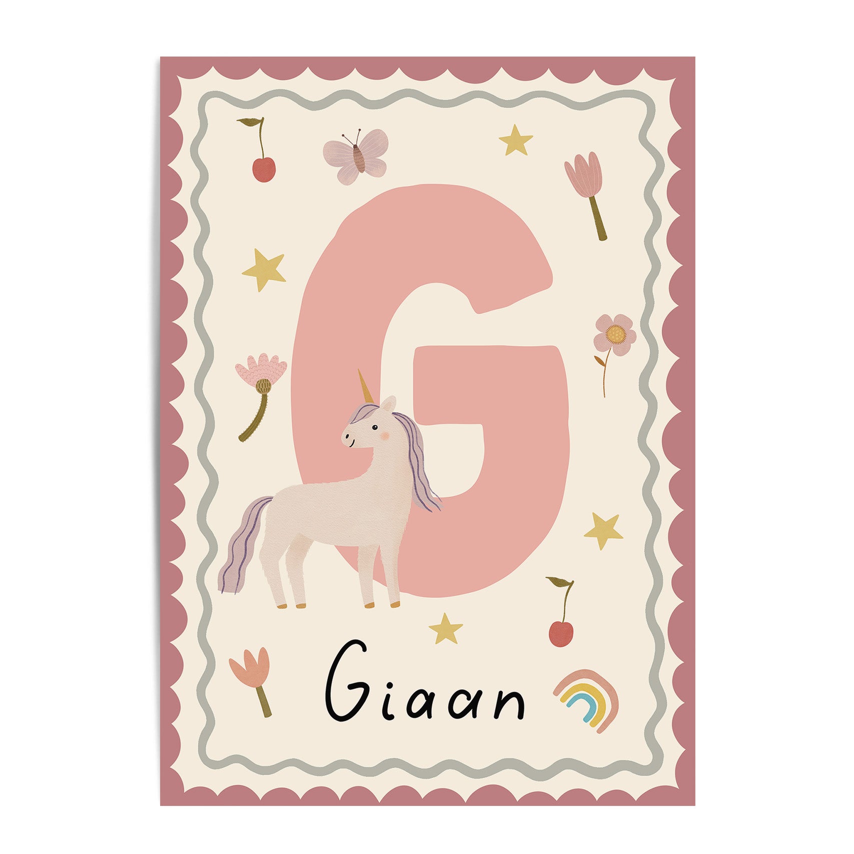 Introduce a touch of magic to your little one's nursery with this whimsical Unicorn Letter & Name Print. Choose your child's initial and watch it come to life, surrounded by a friendly koala, a fluttering butterfly, golden stars, and soft floral blooms — all in a dreamy blush and neutral palette.